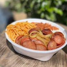 Calabresa acebolada, macarrão, arroz, feijão, farofa e salada.