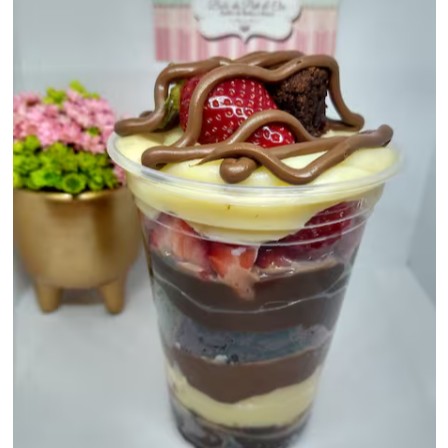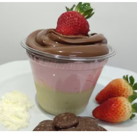 Meio kilo de muita cremosidade e sabor, no copão tem creme de Alpino, brigadeiro de leite Ninho, Nutella, brownie, ganache de chocolate ao leite e morangos fresquinhos!!