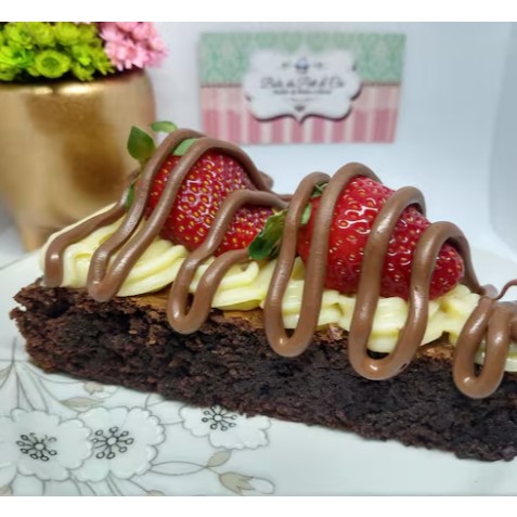 Fatia de brownie coberta com um cremoso brigadeiro de leite Ninho, morangos e Nutella!