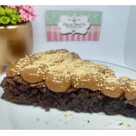 Fatia de brownie coberta com delicioso doce de leite caseiro e farofa de amendoim.