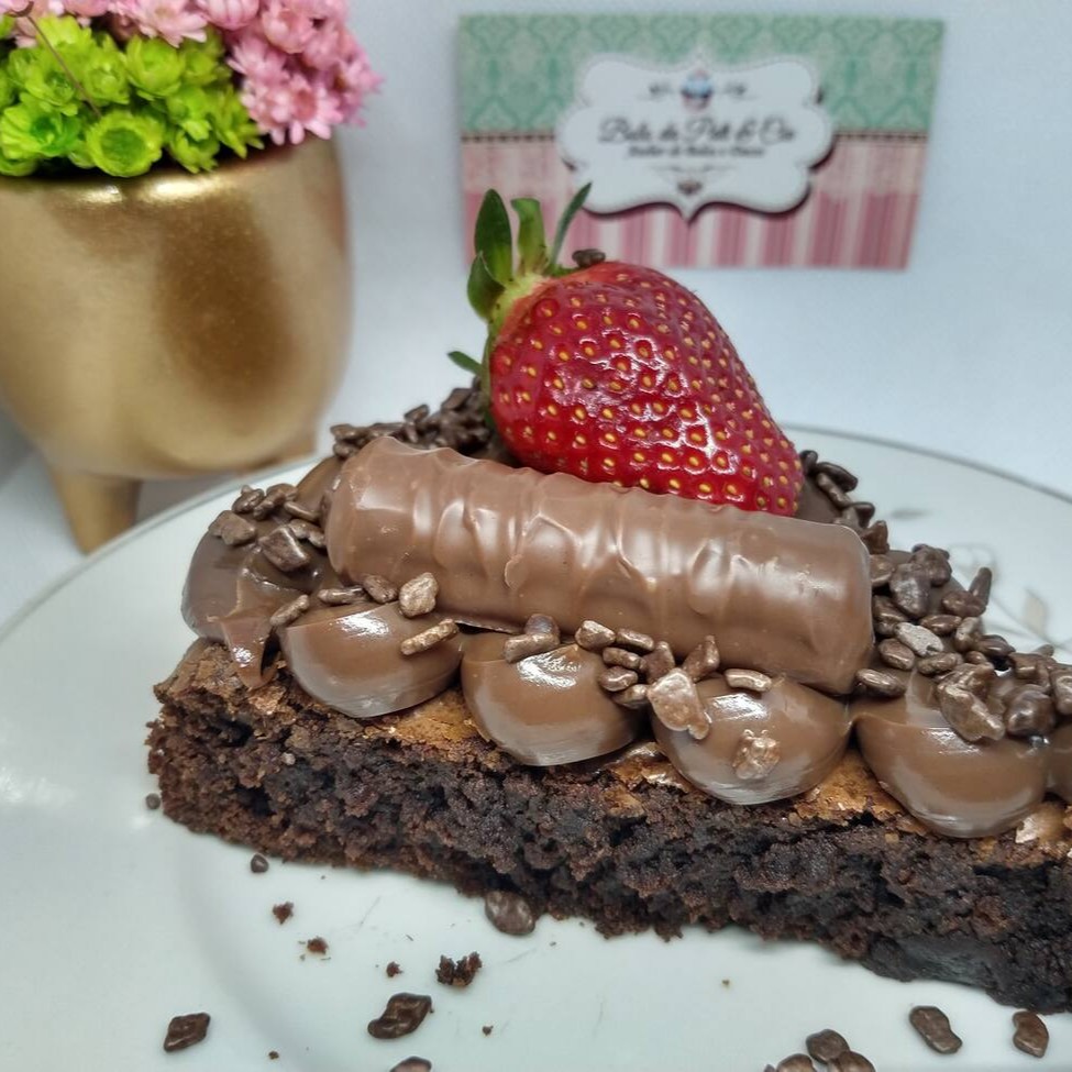 Fatia de brownie coberta com um delicioso brigadeiro de chocolate, morango, Kit Kat e granulados de chocolate.