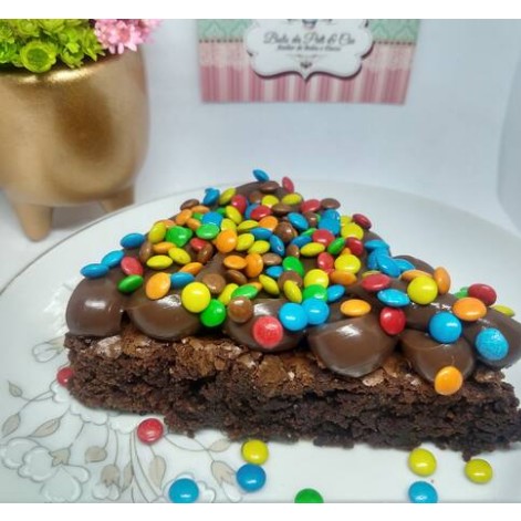 Fatia de brownie coberta com cremoso brigadeiro de chocolate e muuuitos confetes de coloridos de chocolate! Serve 1 pessoa