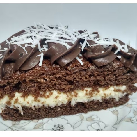 Deliciosa massa de bolo de chocolate, recheada com cremoso recheio de coco e coberta com creme de chocolate e coco ralado.