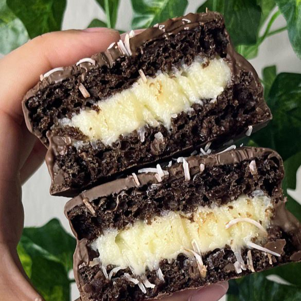Massa pão de ló de baunilha, recheado com cocada cremosa