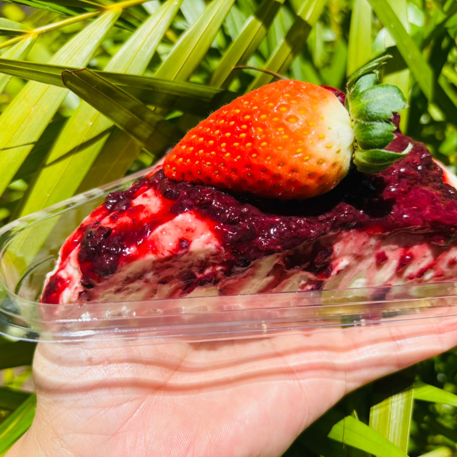 (mousse artesanal de Ninho, bolacha de massa folhada, geleia de morango, morangos frescos e creme 4 leites)