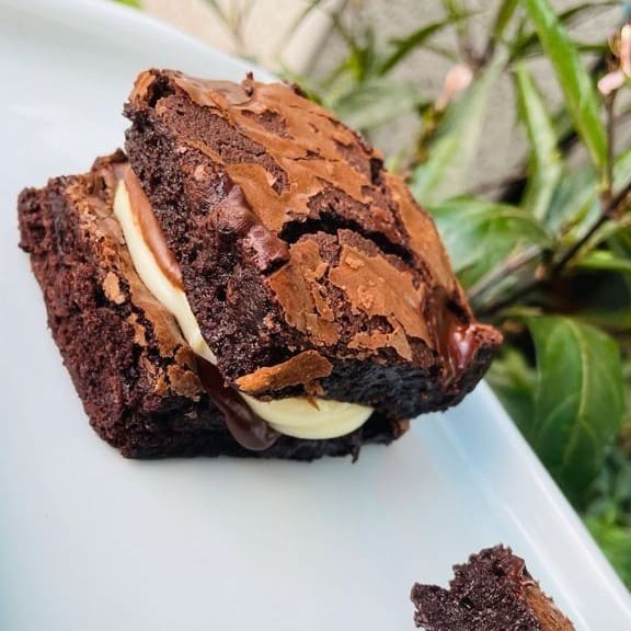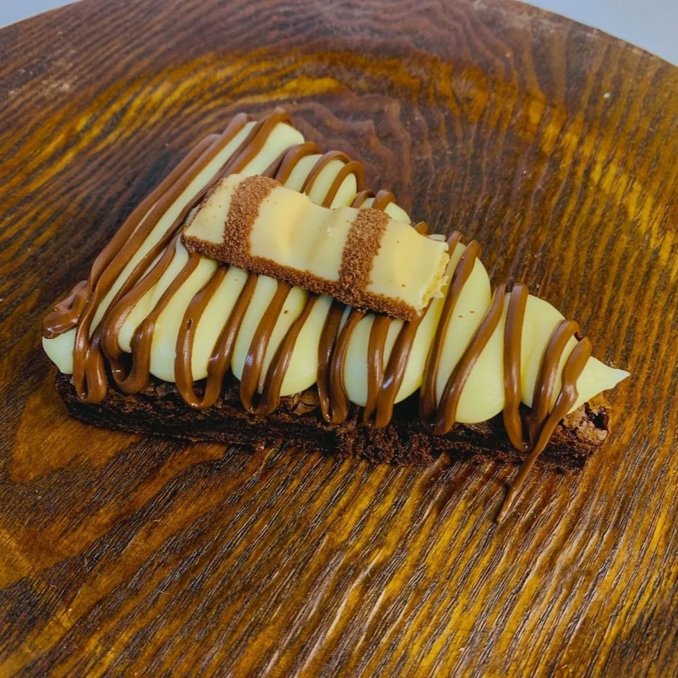 Duas generosas fatias de brownie artesanal de chocolate, duas camadas de creme 4 leites e fios de Nutella