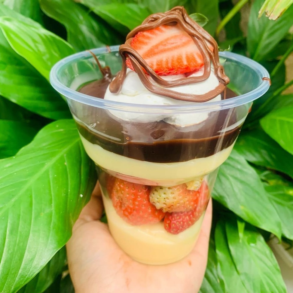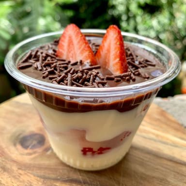 Creme 4 leites, creme de brigadeiro cremoso, morangos e chantilly (400ml)