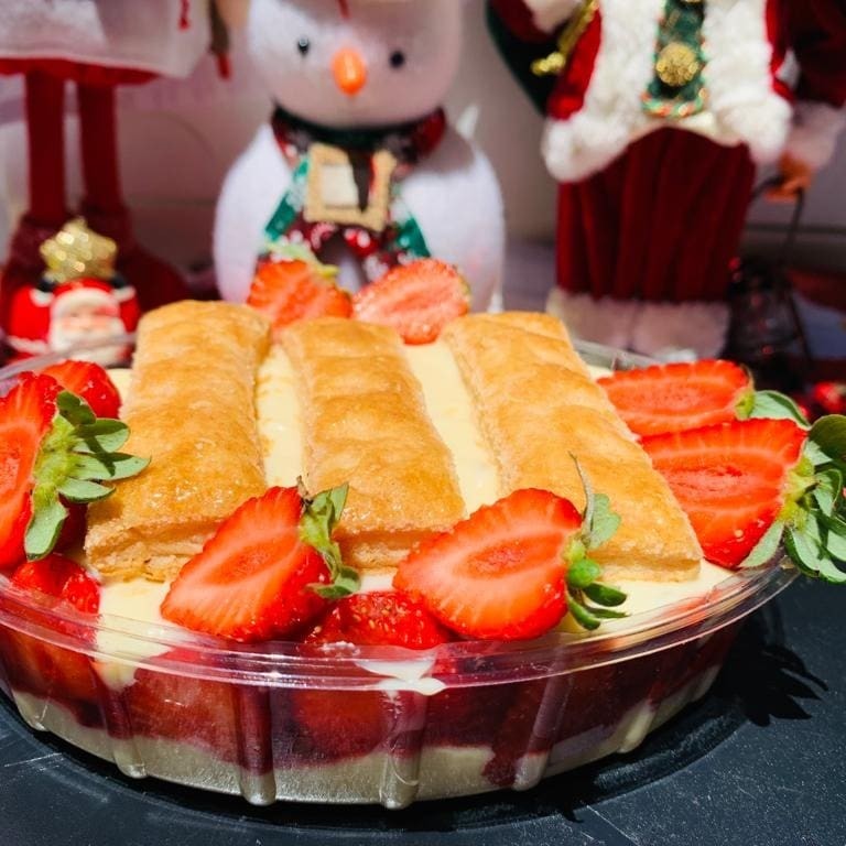 (mousse artesanal de Ninho, bolacha de massa folhada, geleia de morango, morangos frescos e creme 4 leites)