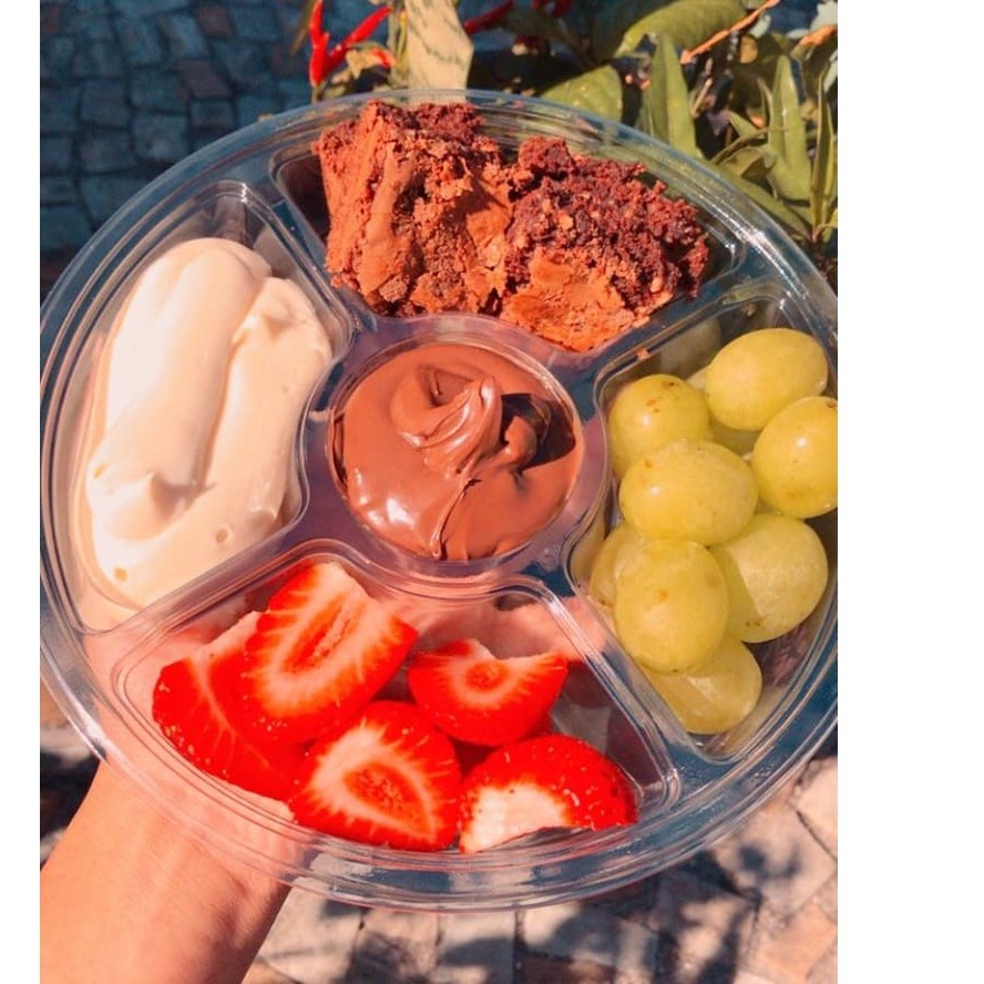 (creme 4 leites, creme de avelã, brownie, uvas e morangos)
