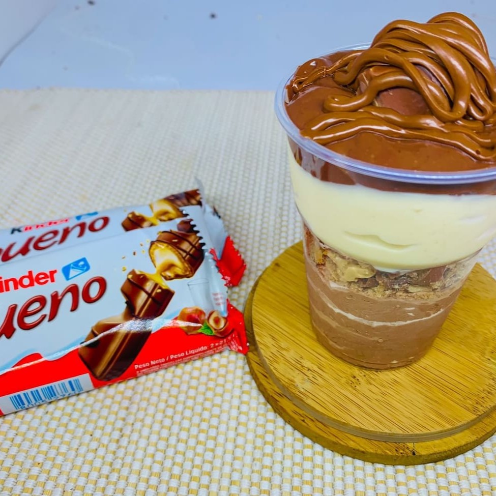 Copo da felicidade composto por nosso maravilhoso mousse artesanal de chocolate, pedaços de Kinder bueno, creme delicioso de 4 leites, creme de brigadeiro cremoso e finalizado com Nutella Original (200ml)