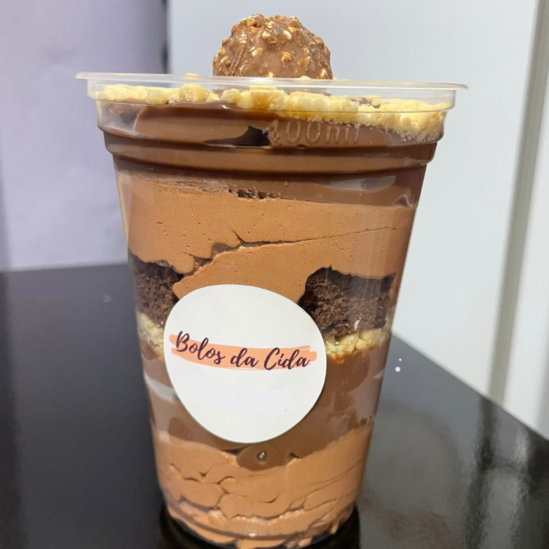 Bolo de massa de chocolate, recheado e coberto com brigadeiro ao leite. 250ml