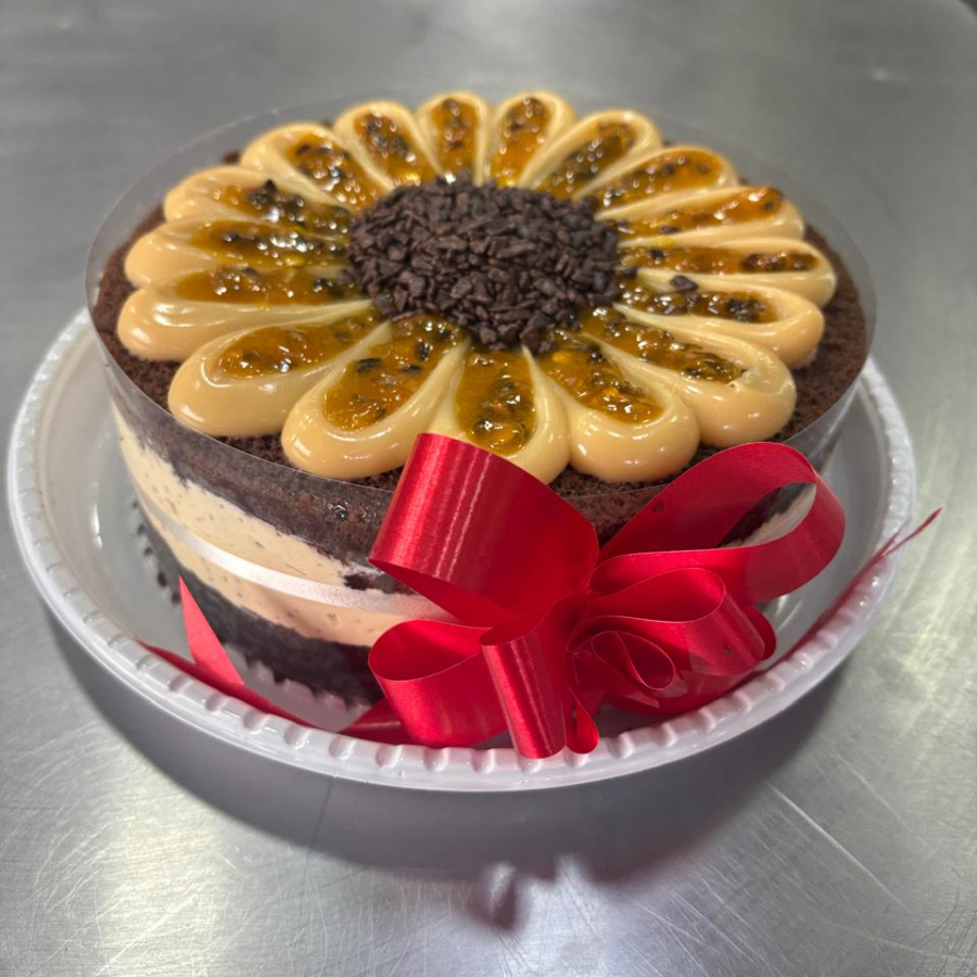 Massa de chocolate recheada de mousse de maracujá, coberto com brigadeiro branco e geléia de maracujá. Serve 5 pessoas