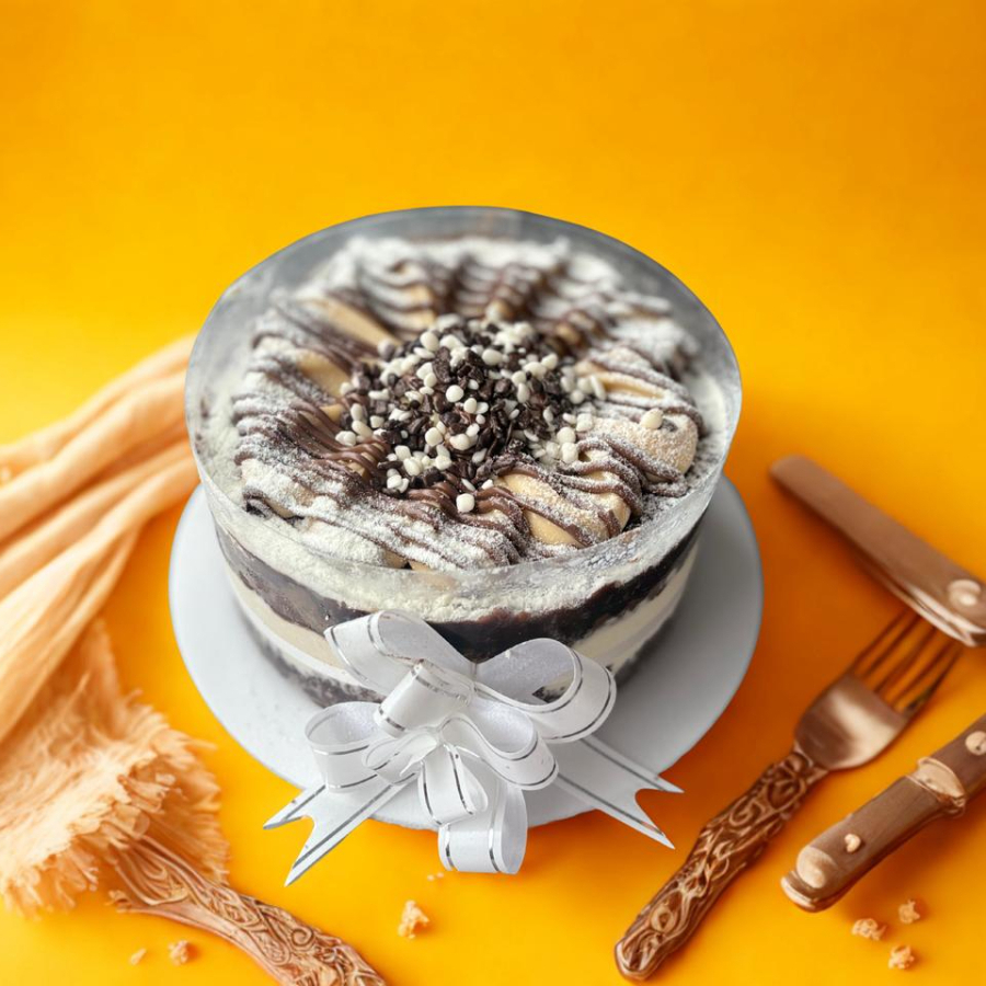 Massa de bauniha recheada de mousse branco com pedacinhos de chocolate branco. Serve 5 pessoas
