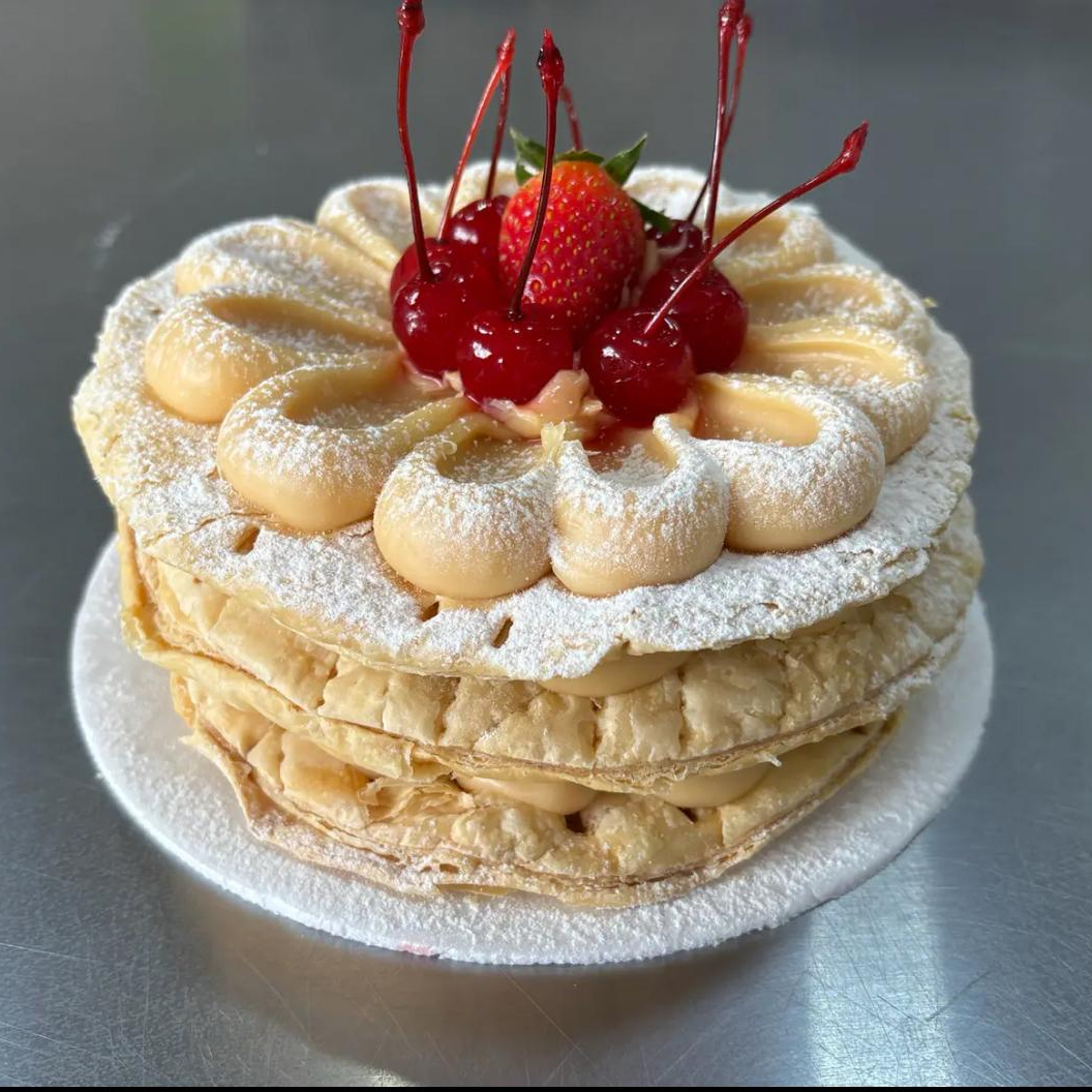 Massa folhada em discos entre camdas de um creme super cremoso e sedoso. Serve 5 pessoas.