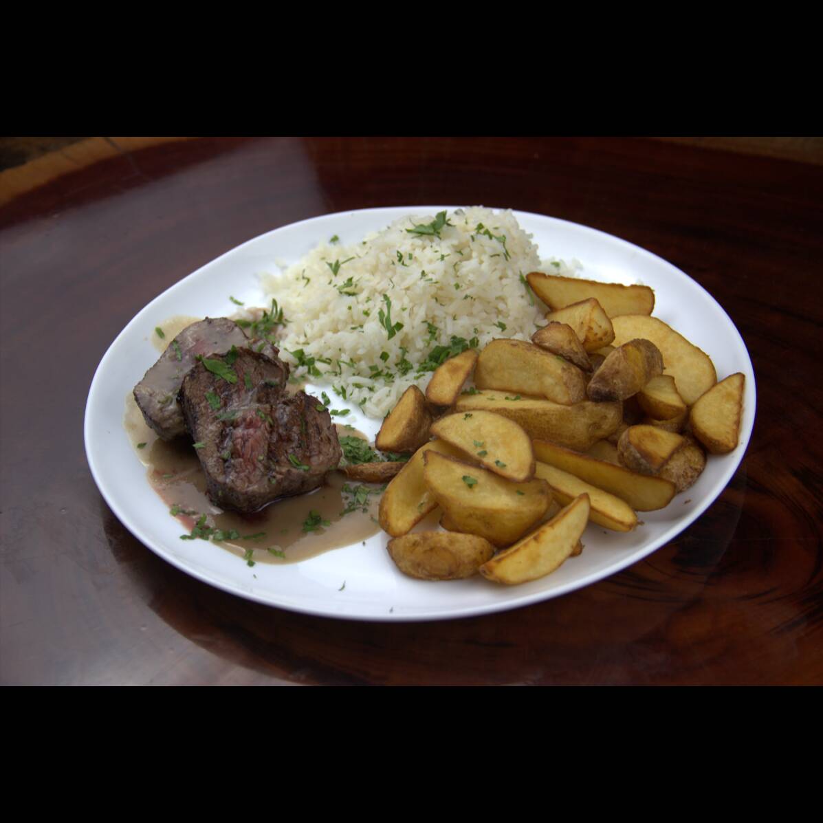 Delicioso medalhão de Filé Mignon grelhado coberto com molho madeira. Acompanha arroz branco e batata rústica.