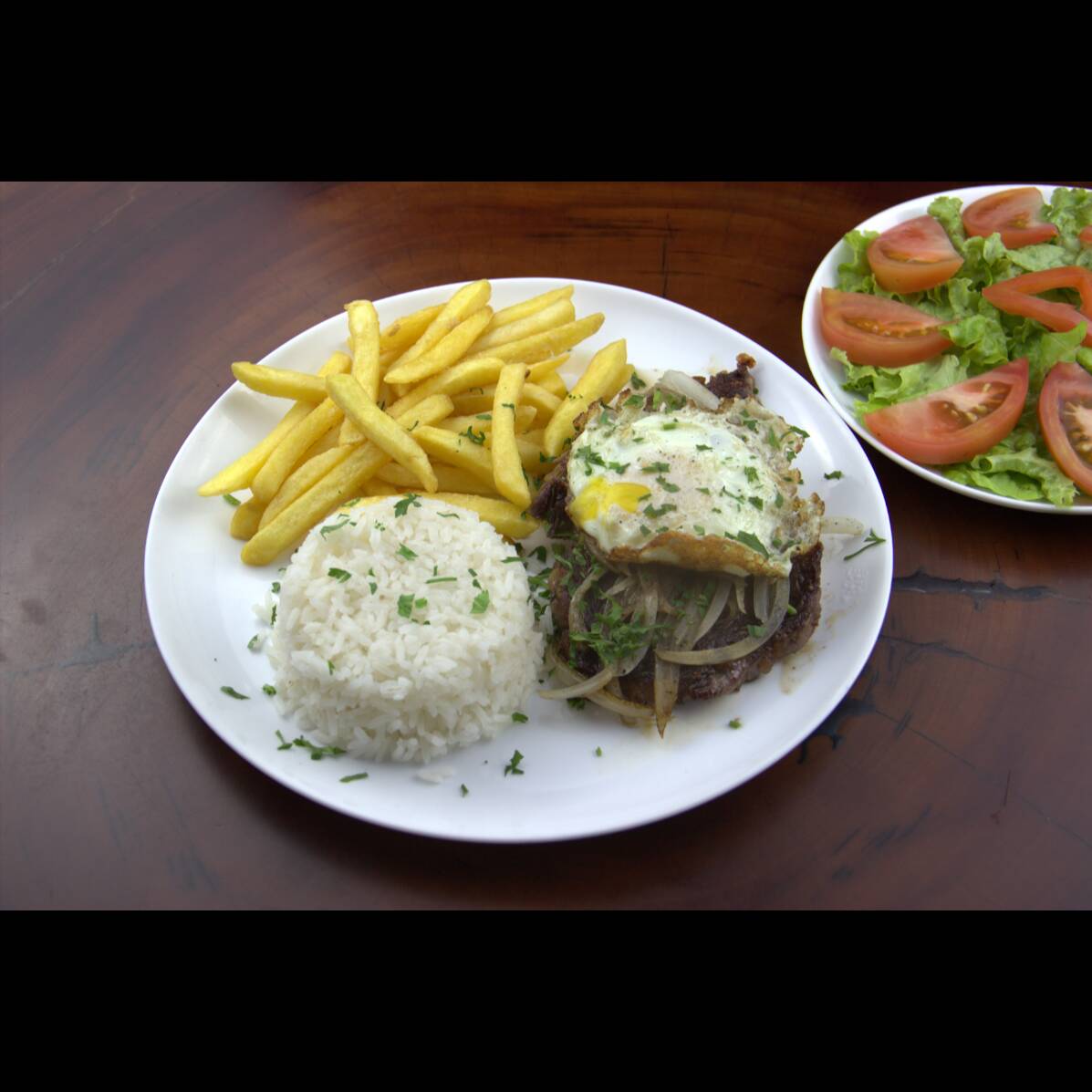 Filé de Ancho grelhado com cebola. Acompanha arroz branco, batata frita e ovo frito e salada