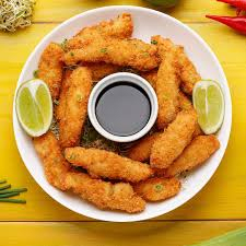 Tiras de Coxa e Sobrecoxa empanadas em farinha Panko, acompanha Molho Verde