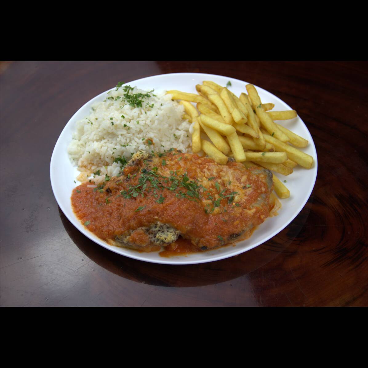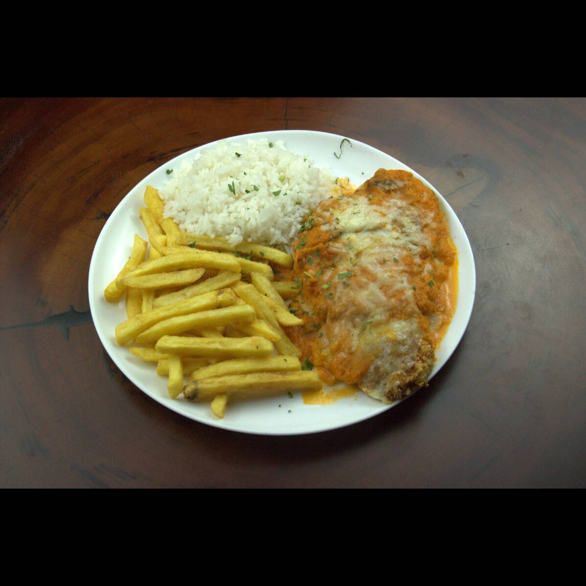 Bife de Frango à milanesa coberto com molho de tomate e queijo muçarela gratinado. Acompanha arroz branco e batata frita.