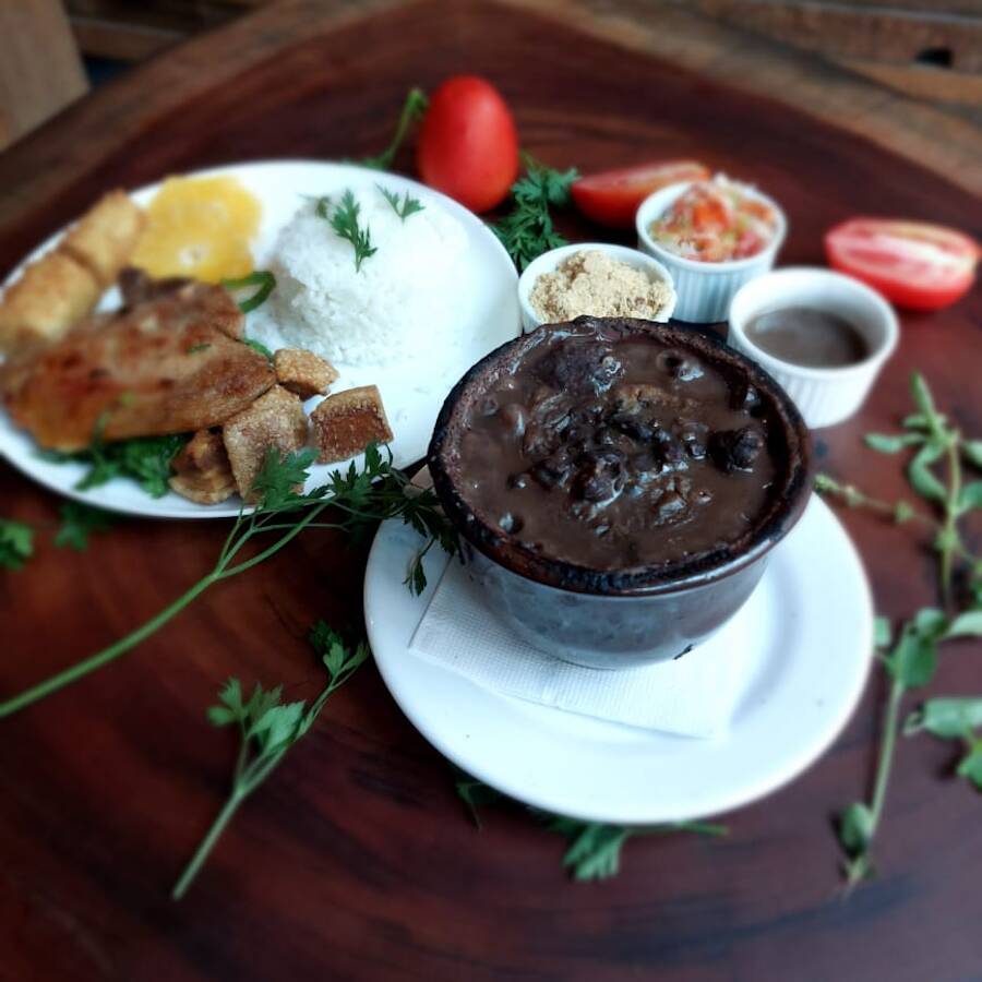 Feijoada composta de feijão preto, carne seca, paio, linguiça calabresa, costela e lombo. Acompanha arroz branco, couve, torresmo, farofa, vinagrete, molho de pimenta, bisteca e banana frita.