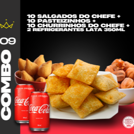 10 Salgados do Chefe + 10 Pasteizinhos do Chefe + 10 Churrinhos do Chefe + 2 Refrigerantes Lata. Escolha os sabores: Frango, Queijo, Presunto e Queijo, Carne e Calabresa / Carne e Queijo / Doce de Leite, Chocolate e Beijinho.