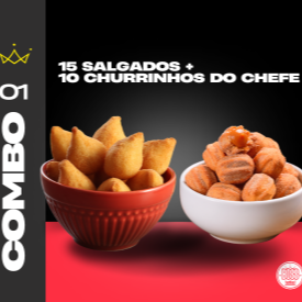 Combo: 15 Salgados do Chefe + 10 Churrinhos do Chefe. Escolha os sabores dos salgados (frango, queijo, presunto e queijo, carne ou calabresa) e dos churrinhos (doce de leite, chocolate ou beijinho).