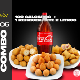 Combo: 100 Salgados do Chefe + 1 Refrigerante 2l. Escolha os sabores dos salgados: frango, queijo, presunto e queijo, carne ou calabresa.