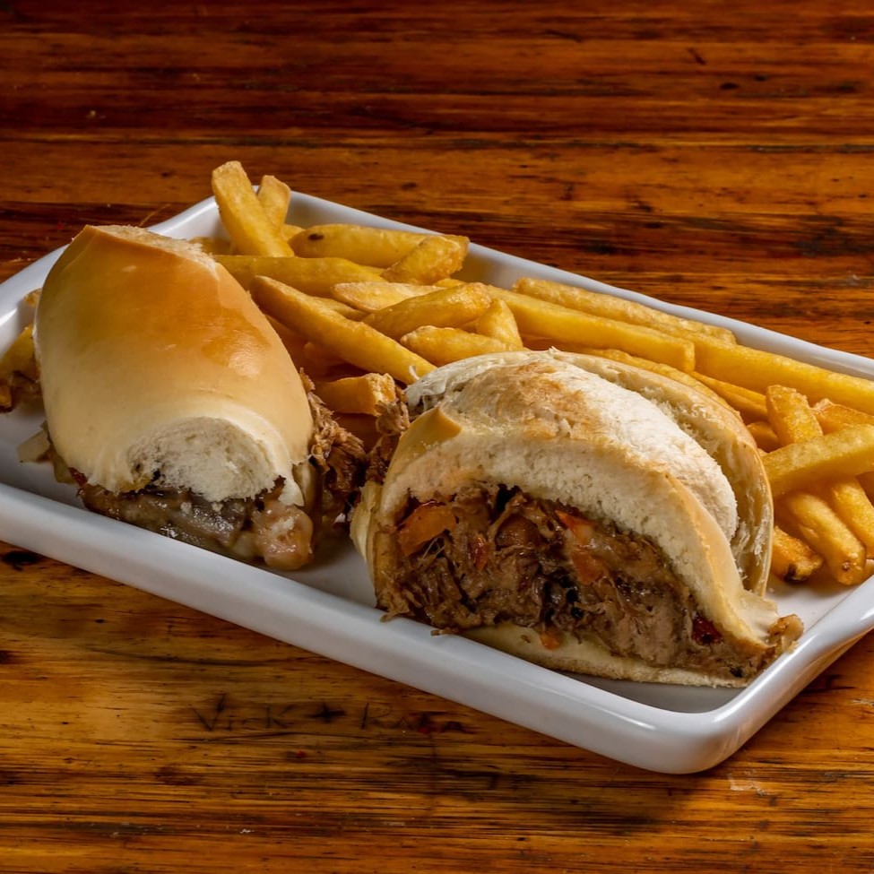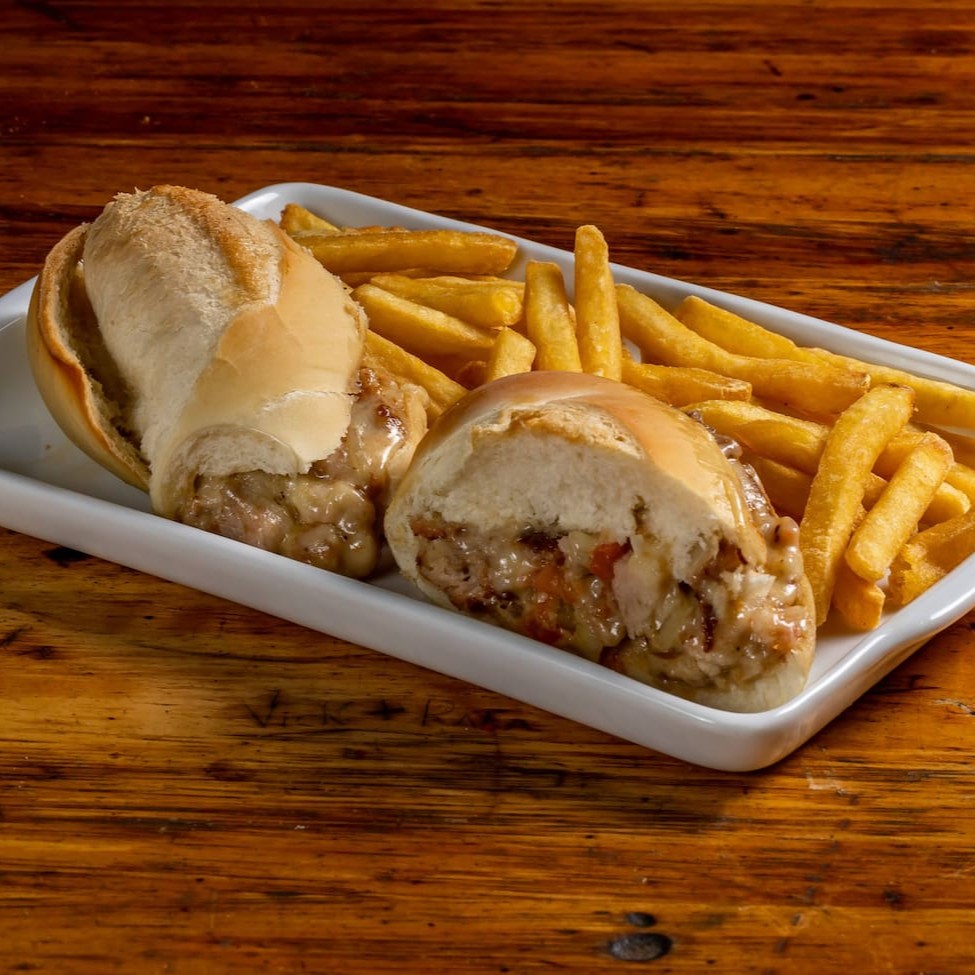 A famosa Carne seca do Boteco 647 com queijo e vinagrete servido no pão Frances. Acompanha Fritas.