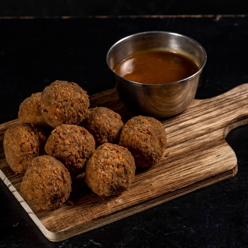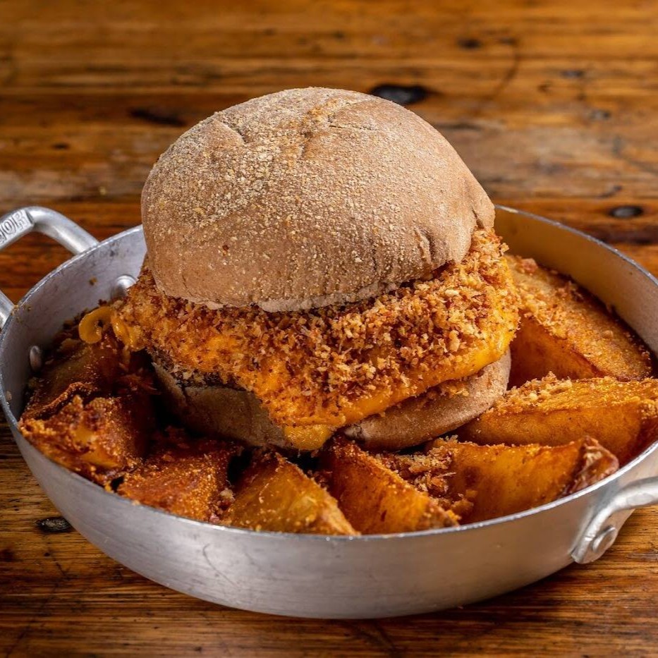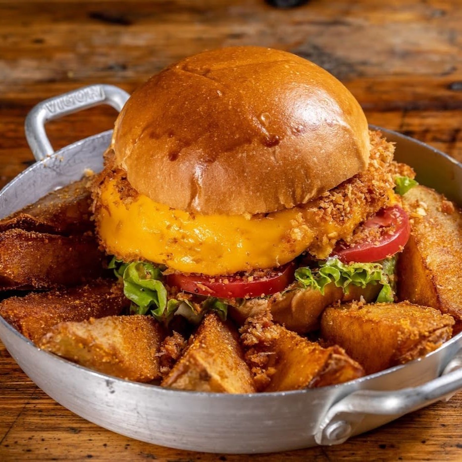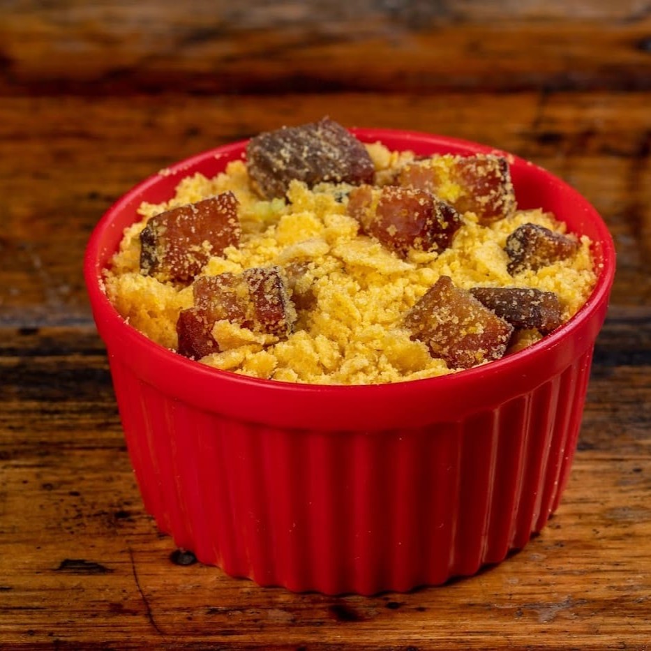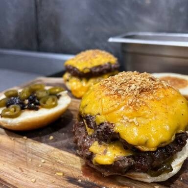 Dois hambúrgueres de picanha, queijo cheddar picles de pimenta jalapeno, cebola caramelizada e farofa de bacon.