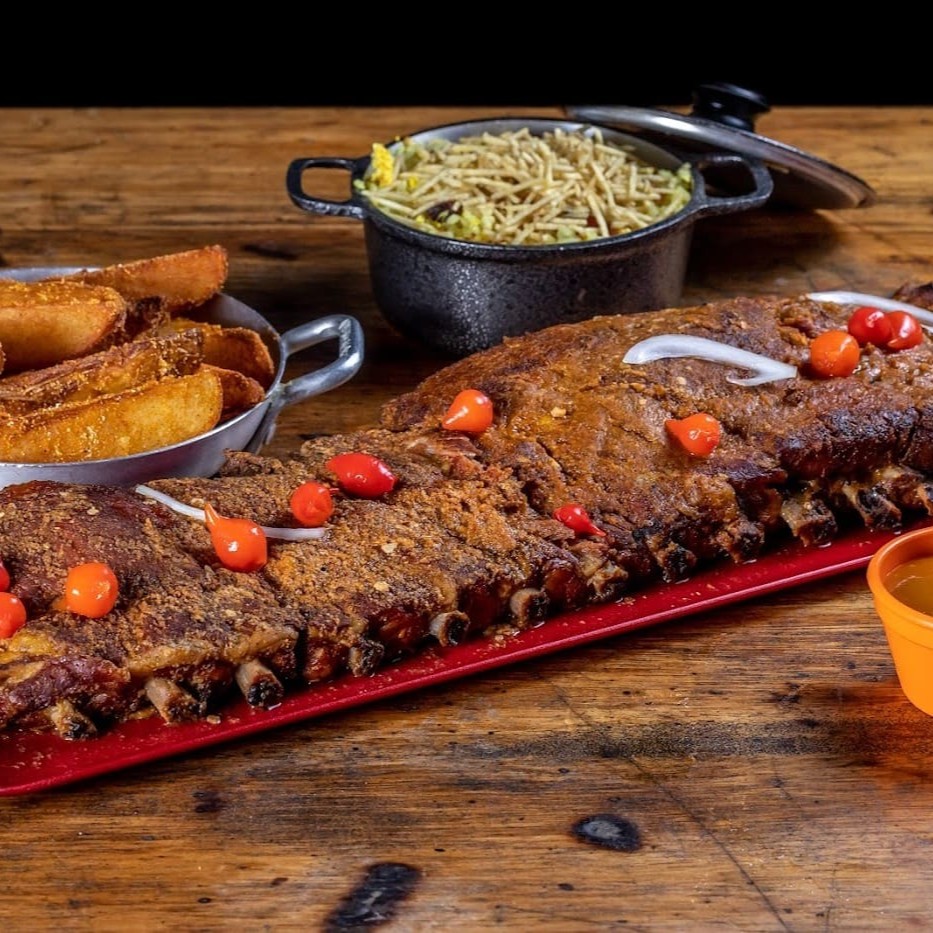 A nossa saborosa Pork Ribs é defumada e assada em pit smoker acompanha 1kg de costela, batata rústica e arroz Biro-Biro e molho barbecue