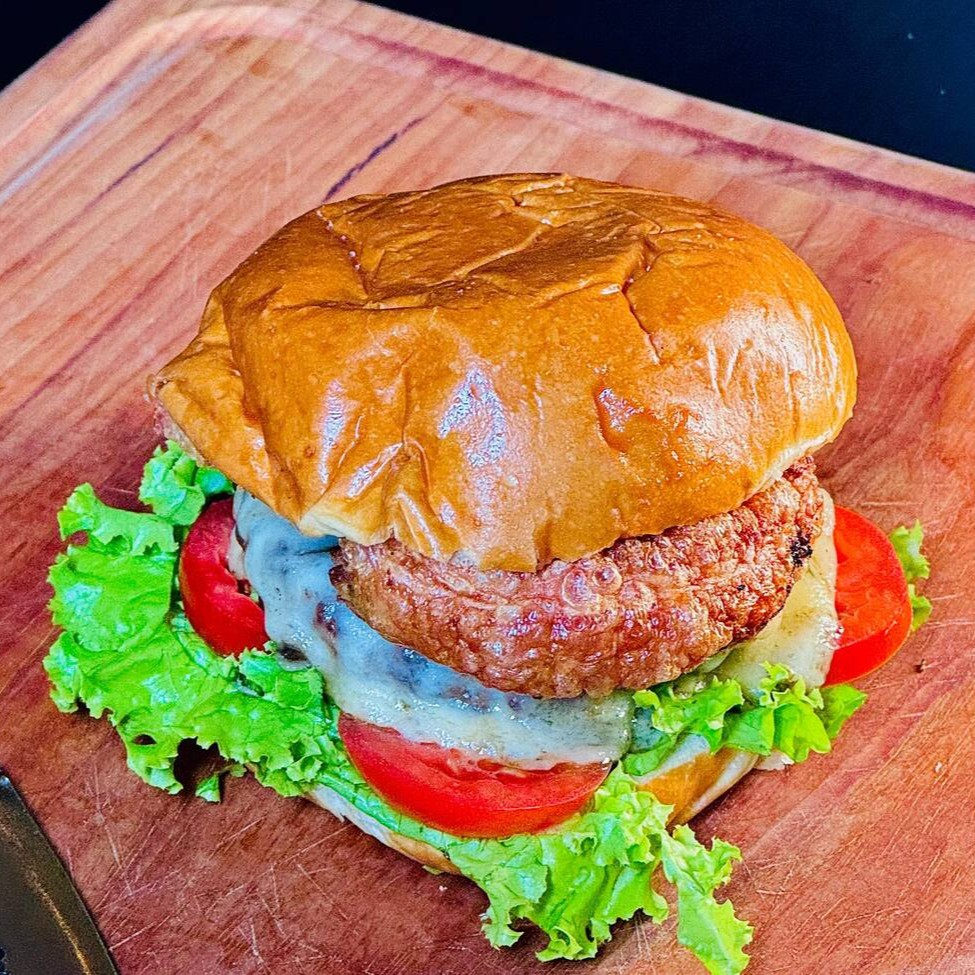 Pão de brioche, hambúrguer de picanha, queijo prato, alface, tomate torresmo de ouro