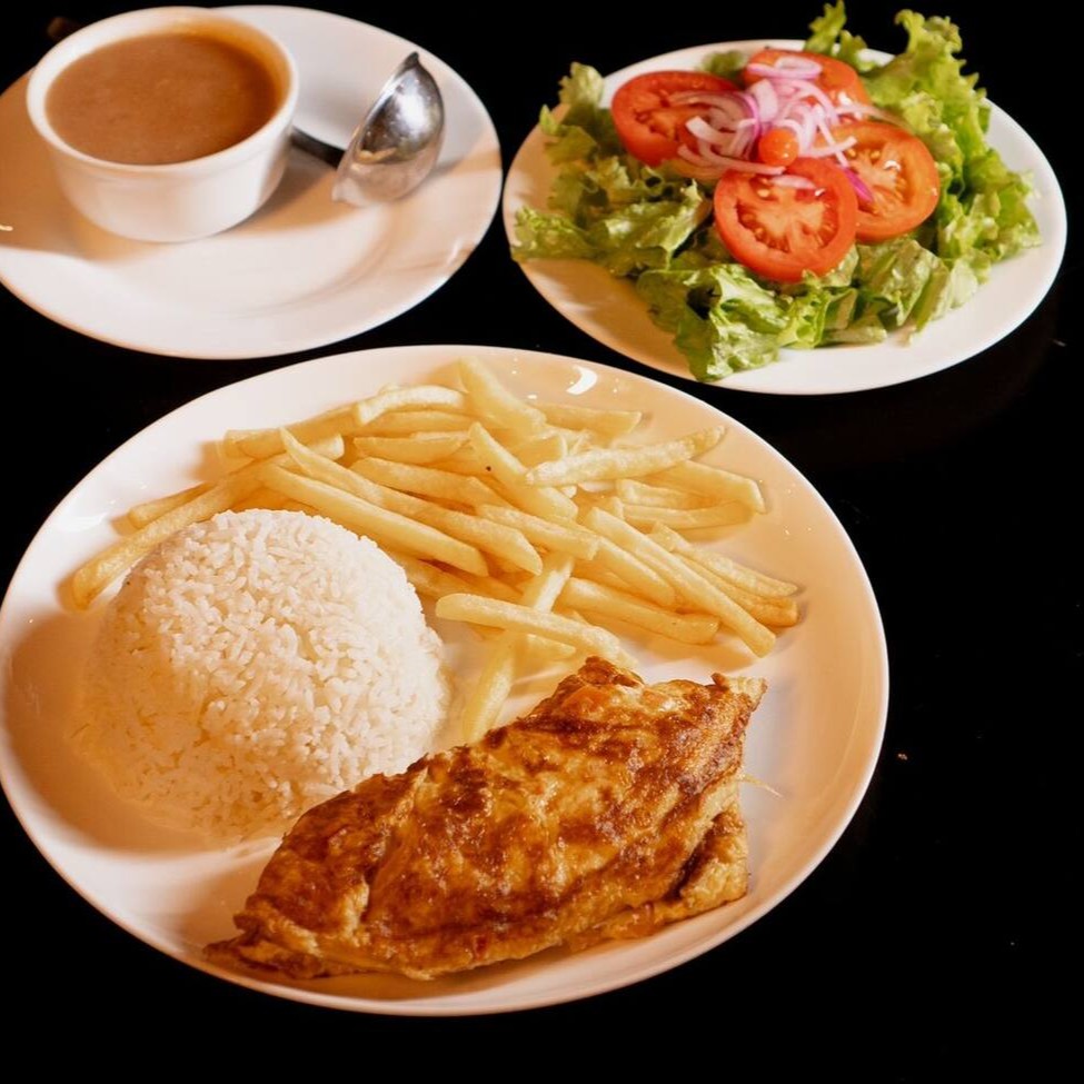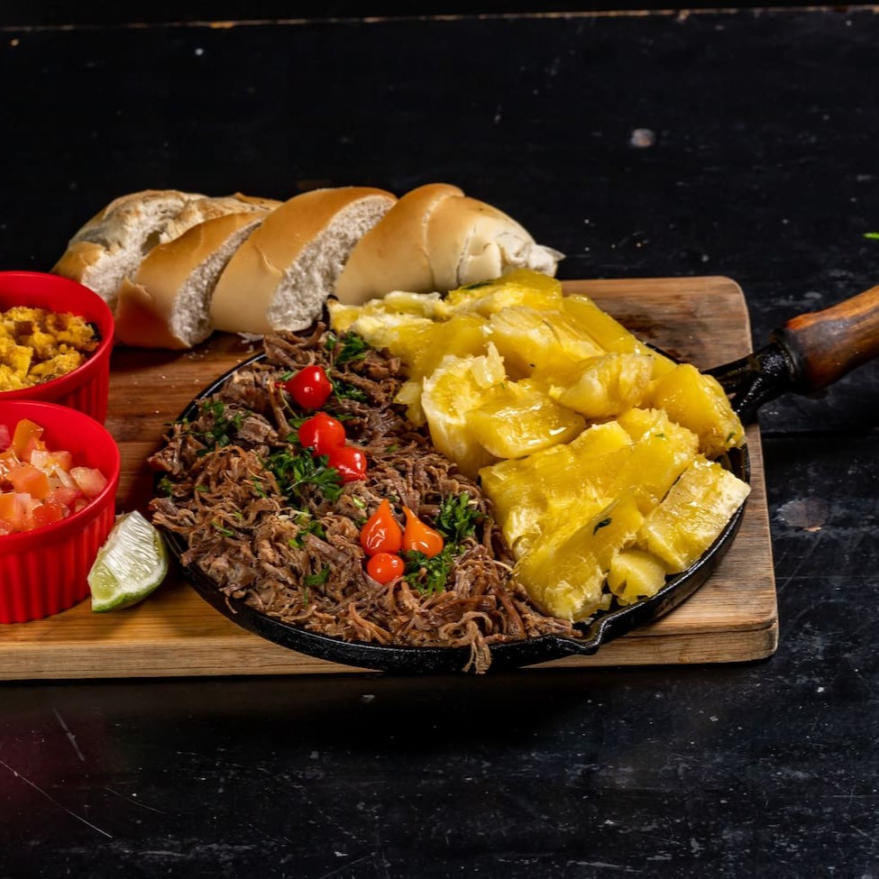 Carne seca desfiada com mandioca cozida ou frita feita na manteiga de garrafa. Acompanha farofa, vinagrete e pão frances ( carne seca especial do boteco 647)