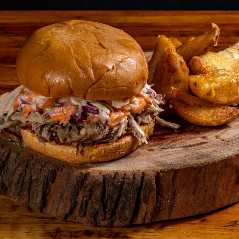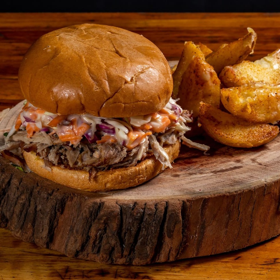 150 gr de corte suíno pulled pork, salada coleslaw e acompanha batata rustica.