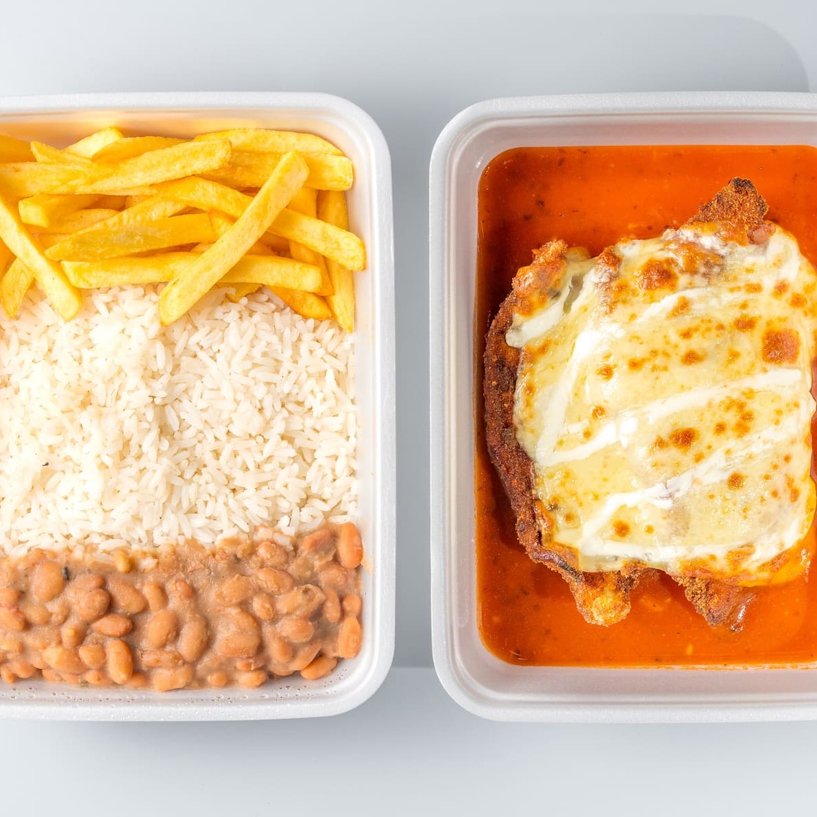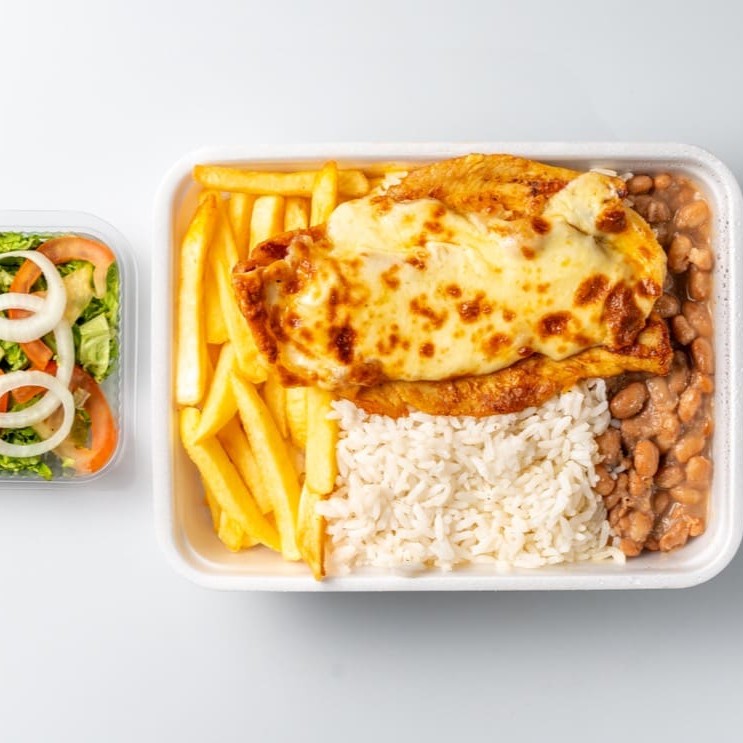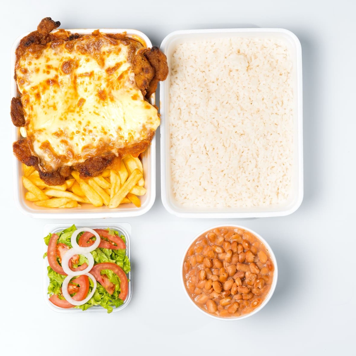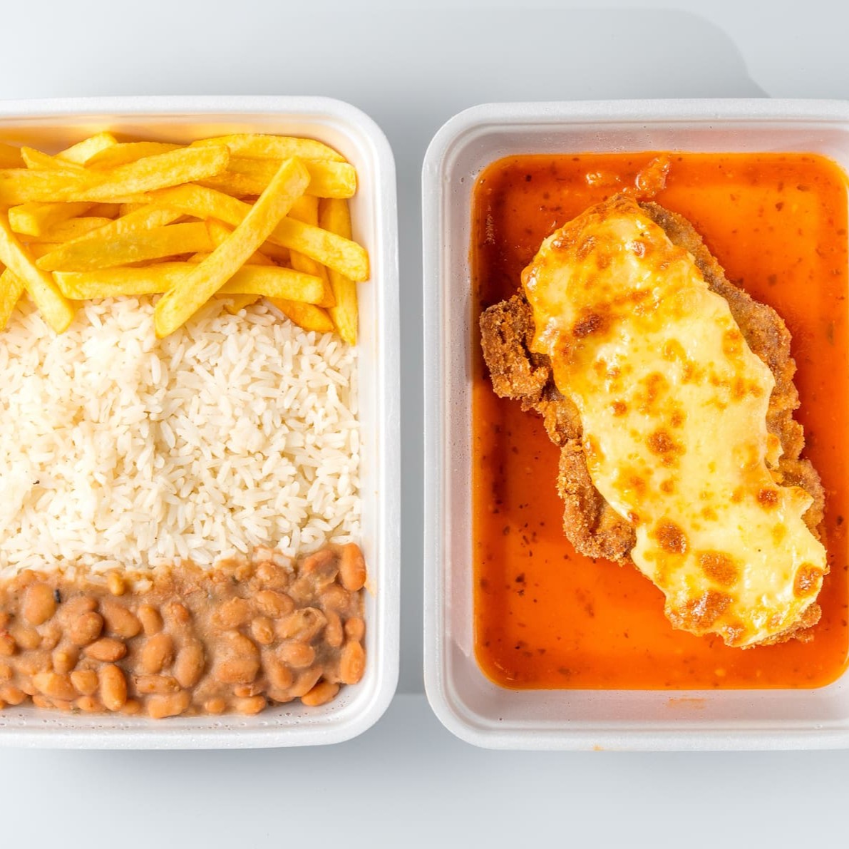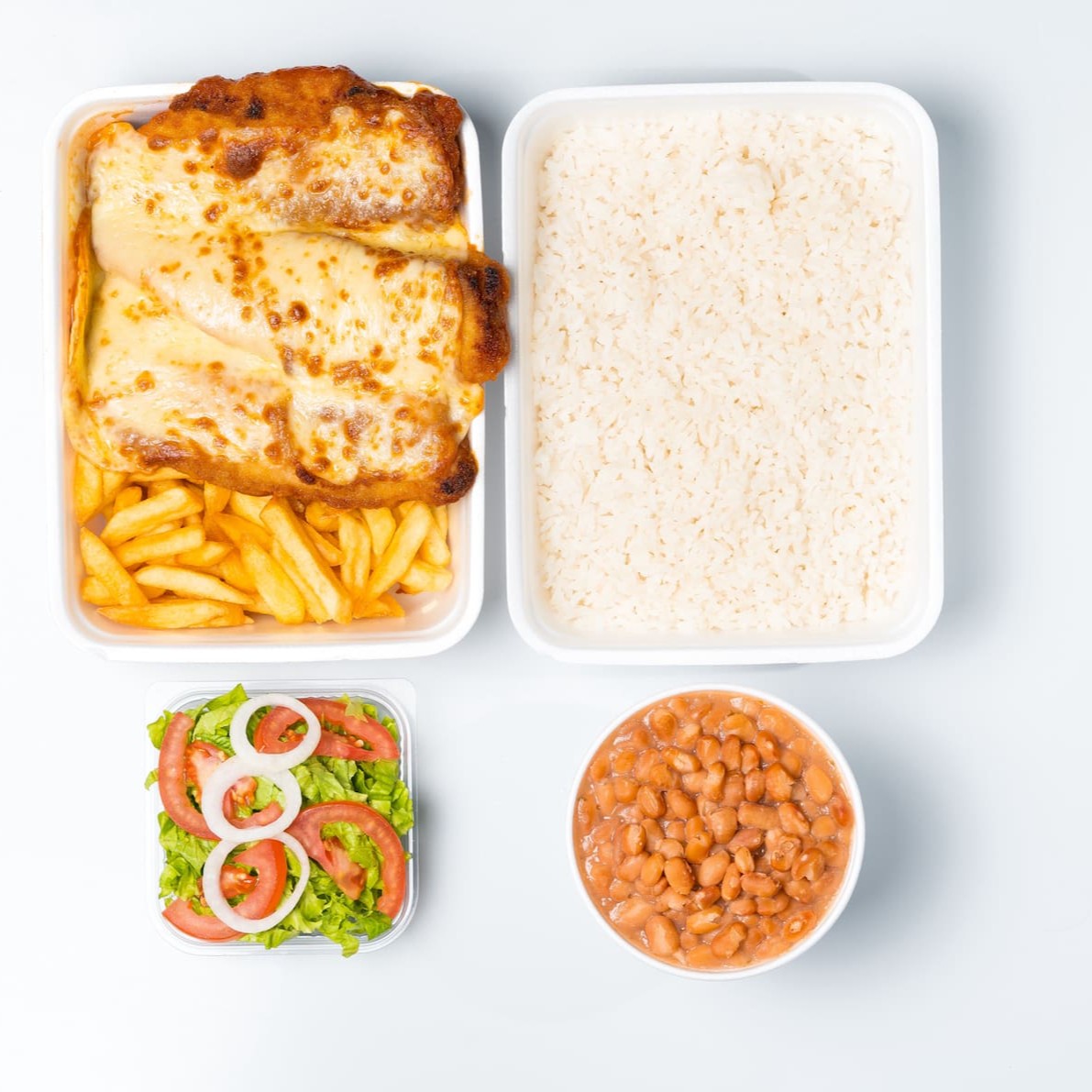 Aproveite nossa oferta do Dia com até 50% de desconto! Nossa deliciosa 'Marmita-Frango à Parmegiana dois queijos Individual' é uma verdadeira explosão de sabores. O prato é composto por um suculento frango à parmegiana, cuidadosamente preparado e coberto com um queijo derretido irresistível. Para acompanhar, escolha entre um arroz fresquinho e um feijão caseiro, ambos preparados com carinho, ou op