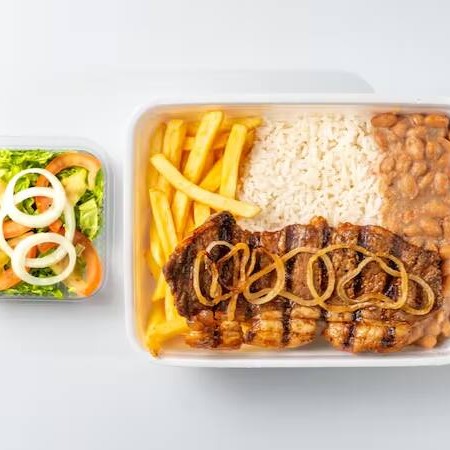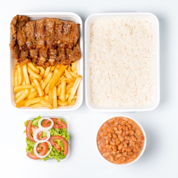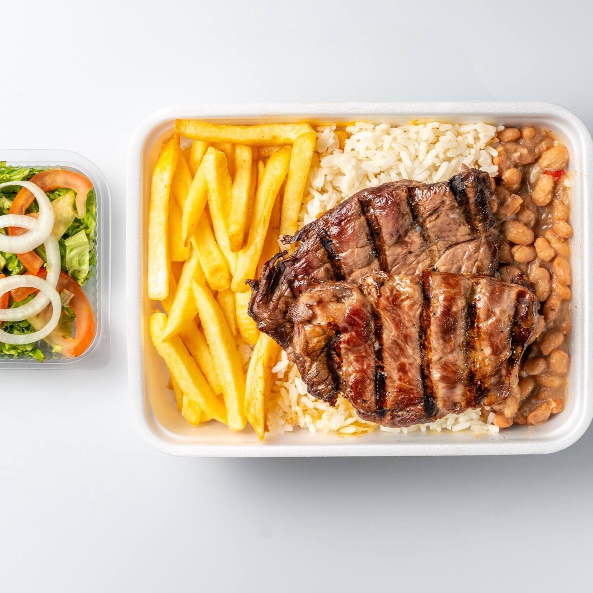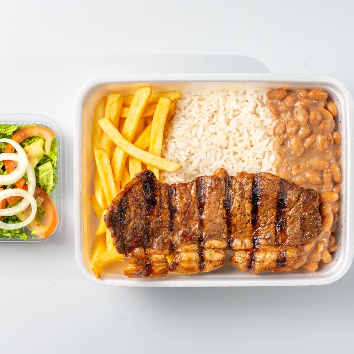 Desfrute da nossa 'Marmita-Bife de Contrafilé Individual', uma pechincha na categoria 'Marmitex com até 25% de Desconto'. Este prato é composto por um suculento bife de contrafilé, grelhado à perfeição para destacar todo o seu sabor autêntico. Acompanhado de itens clássicos da culinária brasileira: arroz soltinho e aromático, feijão fresco e bem temperado, que são a alma deste prato. Para completa