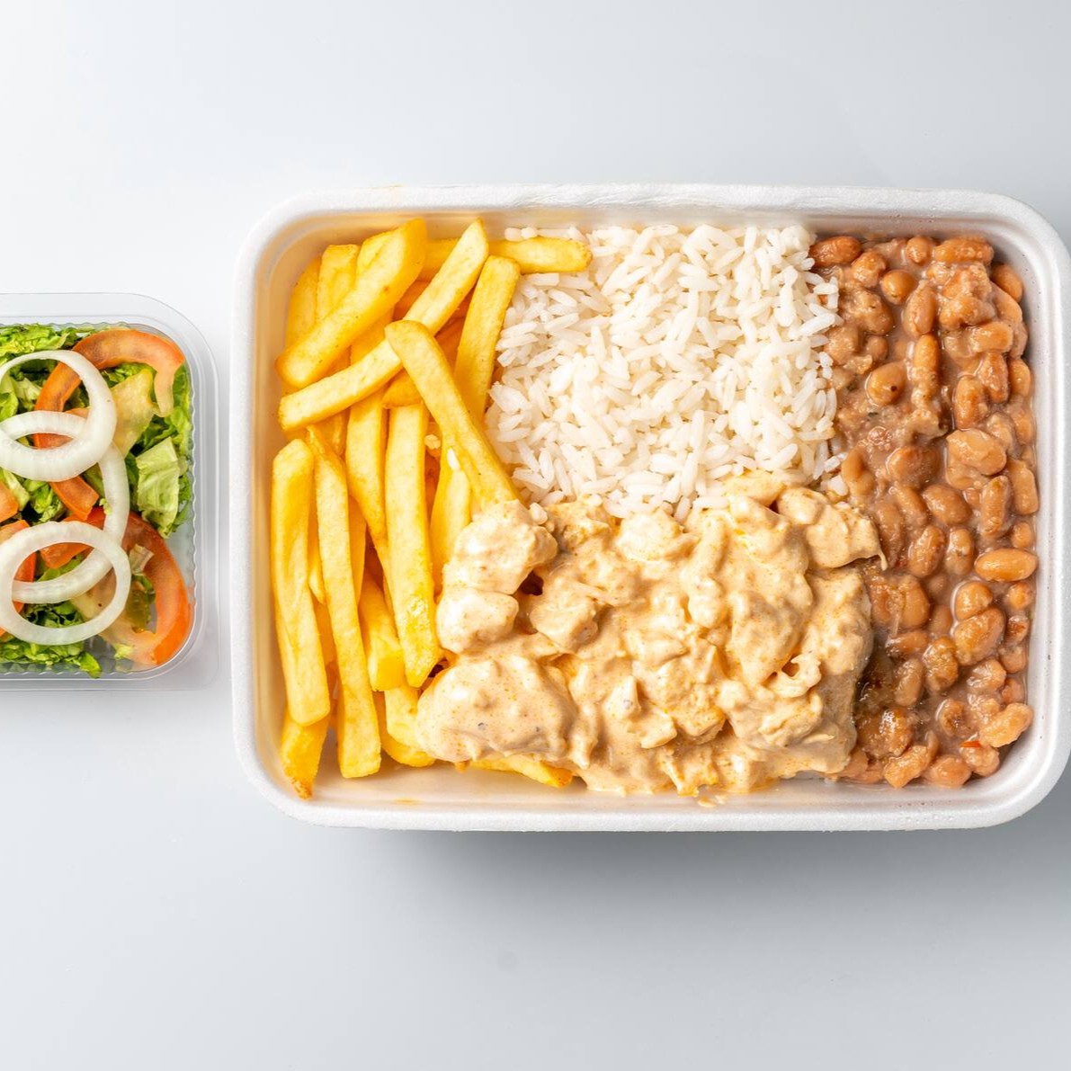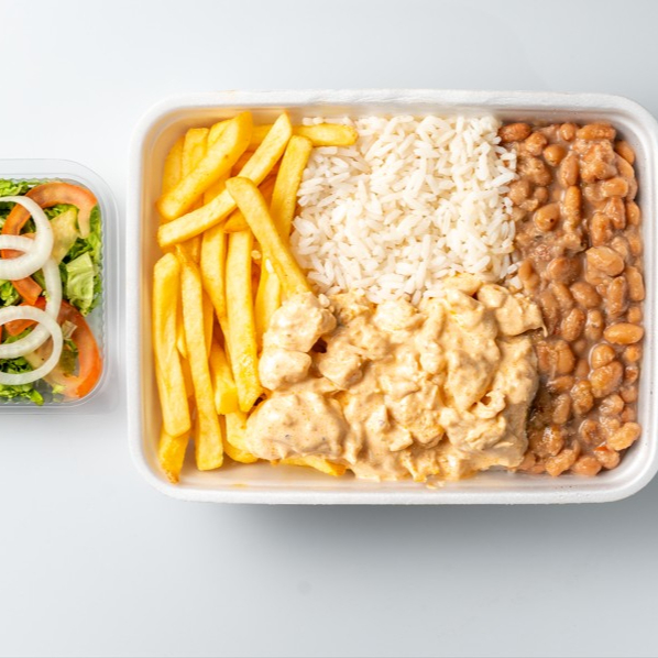 Aproveite uma deliciosa marmita, meticulosamente preparada com um saboroso strogonoff de frango. O prato, repleto de sabor, acompanha arroz branco, perfeitamente cozido, e crocante batata palha. Tudo isso compõe a nossa 'Promoção Marmitex', pensada para proporcionar uma refeição completa e prazerosa. A combinação perfeita para saciar a sua fome com qualidade e um toque de requinte!