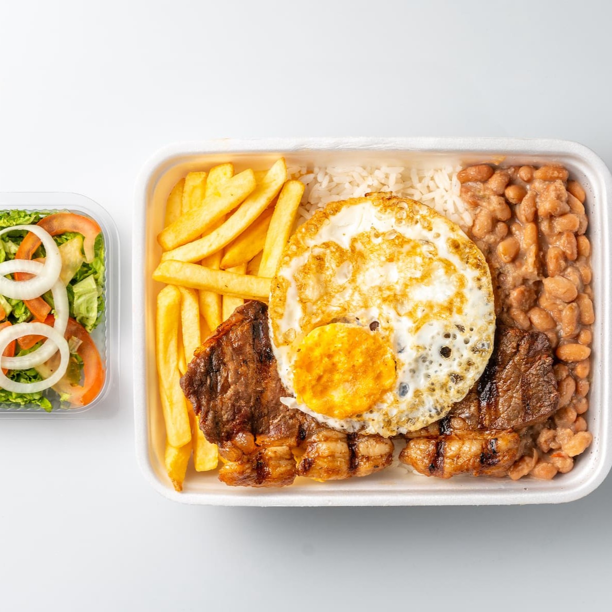 A Marmita-Bife à Cavalo Individual é um deleite para os amantes da boa culinária. Cuidadosamente preparada, essa refeição apresenta um suculento bife, grelhado à perfeição, servido à moda 'à cavalo' com um ovo frito por cima. Acompanhado de arroz branco, macio e soltinho, e feijão temperado com especiarias que realçam seu sabor. A oferta fica ainda mais completa com a opção de salada fresca e colo