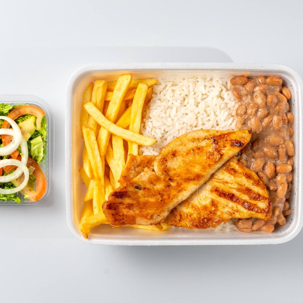 Acompanha arroz, feijão, salada ou batata frita