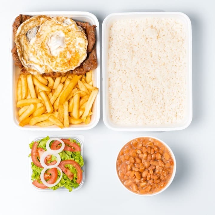 A 'Marmita-Bife à Cavalo para 2 pessoas' é uma oferta imperdível na nossa categoria 'Promoção Marmitex com até 50% de Desconto'. Este prato é composto por um suculento bife, preparado com maestria, e servido à cavalo, acompanhado de um arroz soltinho e saboroso, um feijão caseiro, bem temperado, que traz o gostinho de comida de casa. Você ainda pode escolher entre uma salada fresca e crocante ou n