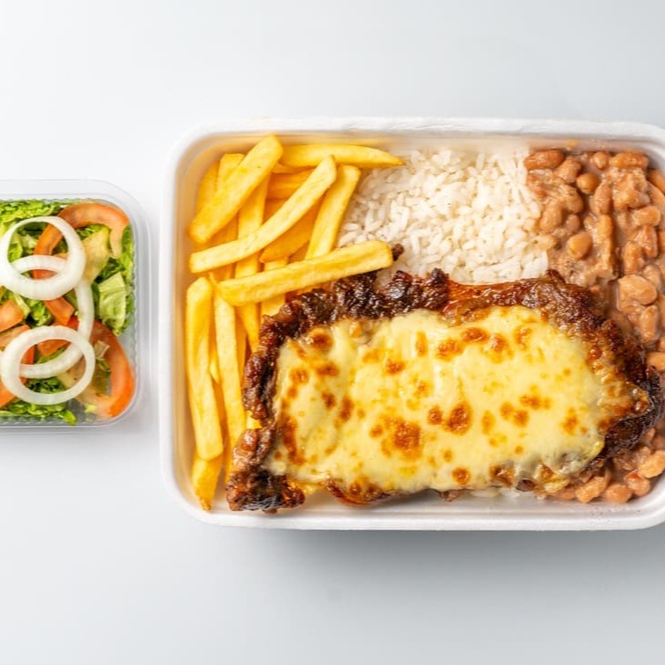 Delicie-se com a nossa Marmita-Bife à Parmegiana Individual, uma das estrelas do nosso menu de 'Ofertas do Dia com até 50% Off'. Este prato exibe um suculento bife à parmegiana, delicadamente empanado e coberto com um molho de tomate caseiro e queijo derretido. Acompanhado de arroz soltinho, feijão temperado, e a sua escolha de salada fresca ou batatas fritas crocantes. Uma verdadeira experiência