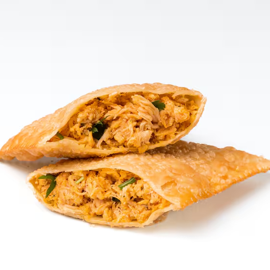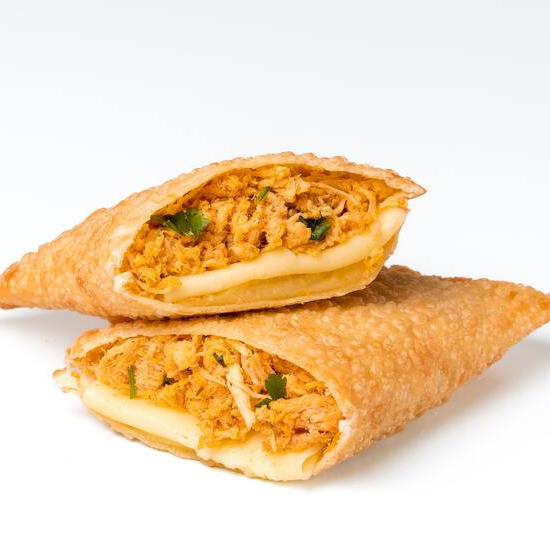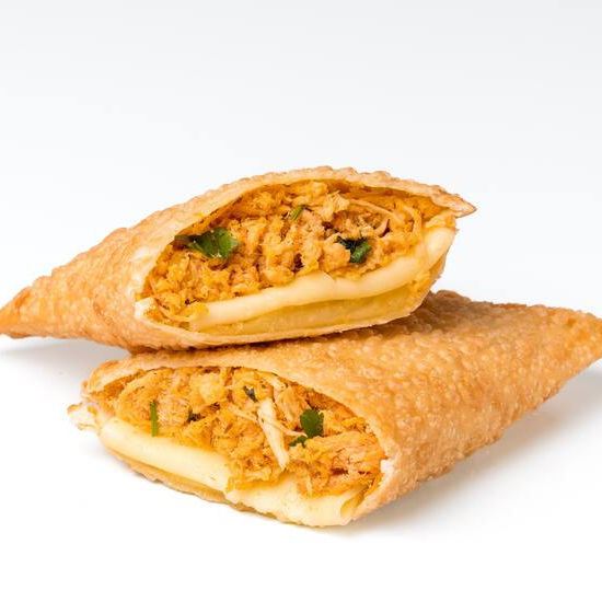 Pastel de Frango com Catupiry Delicioso pastel de frango com Catupiry, um clássico da categoria 'Pastéis de Feira'. Este pastel, frito à perfeição, é recheado generosamente com um frango suculento e temperado na medida certa, harmonizando de forma incrível com o cremoso e inconfundível sabor do Catupiry. A crocância da massa dourada contrasta maravilhosamente com a maciez do recheio, resultando