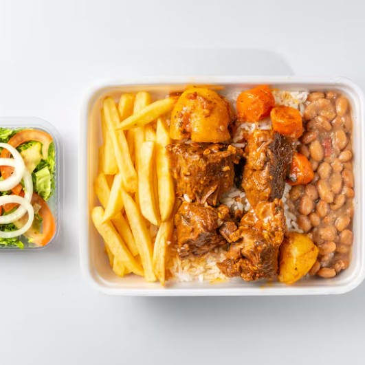 Descubra a deliciosa marmita com carne assada retirada do coração da alcatra, uma seleção premium para satisfazer os paladares mais exigentes. Acompanha arroz soltinho e brilhante, feijão caseiro preparado com tempero especial que traz um toque único ao prato, fritas crocantes e douradas, e uma farofa incrivelmente saborosa. Uma refeição completa e generosamente servida para duas pessoas, perfeita
