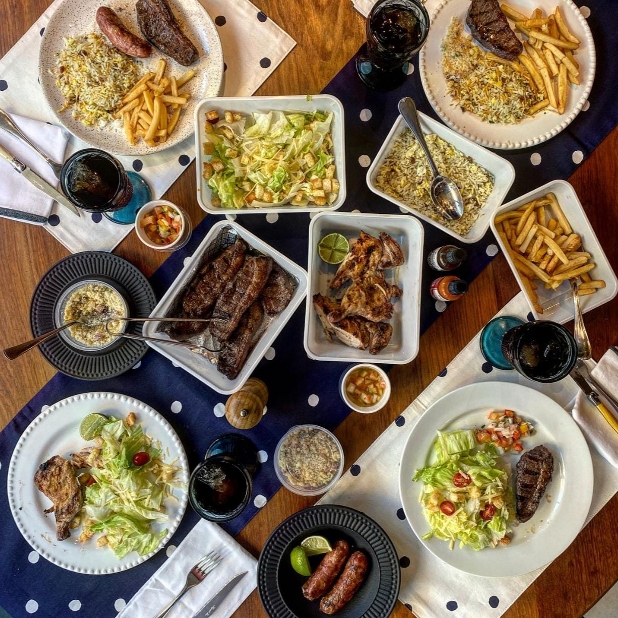 Salada caesar salad ou peito de peru (a escolher) - linguiça toscana, picanha bombom (aprox. 650g in natura), 1 galeto, arroz Bibi Biro e fritas (acompanha: farofa, vinagrete, cebola e chumichurri)