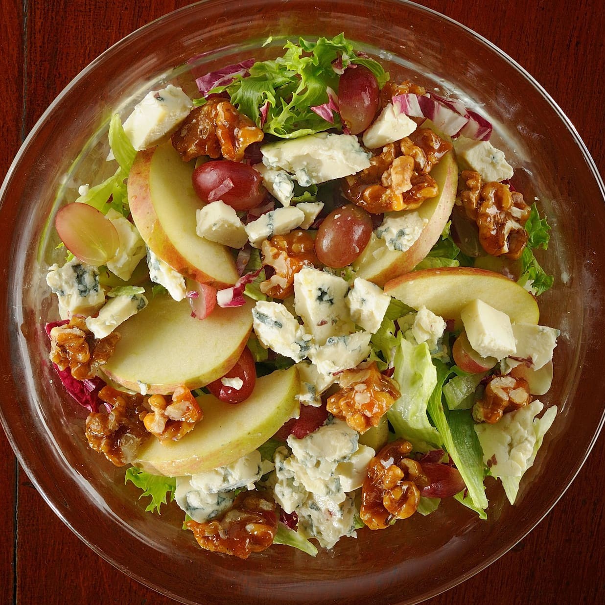 Mix de alface roxa, frisee e americana, rúcula, nozes caramelizada, maçã, uva e queijo gorgonzola, ao molho de mostarda com mel