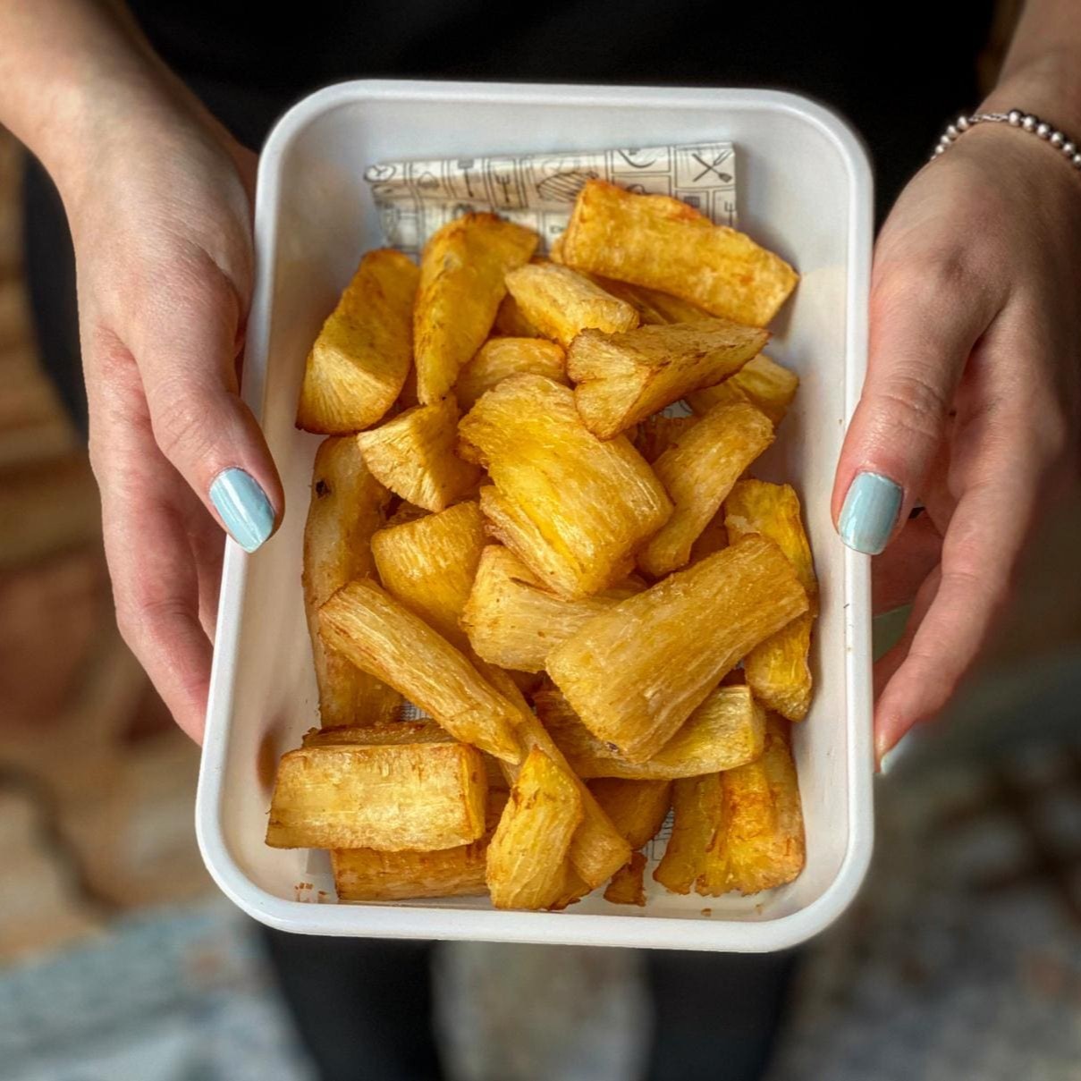 Acompanha Mandioca Cozida , Farofa De Banana E Arroz