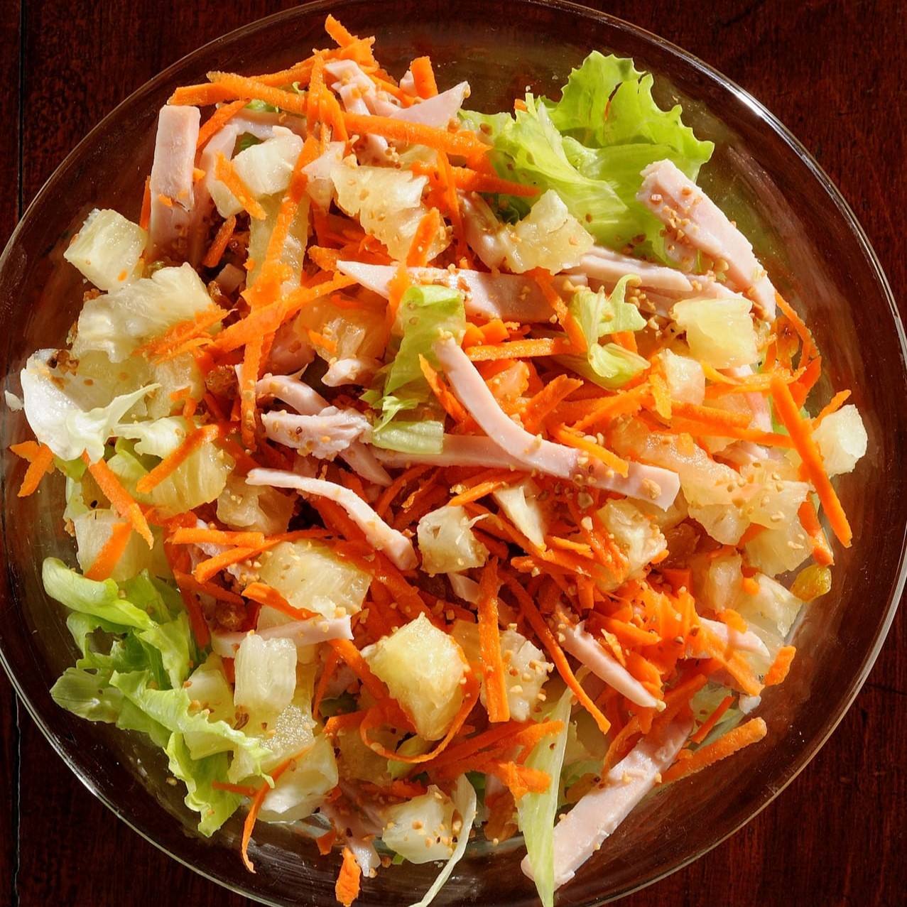 Alface americana, peito de picado, pedaços de abacaxi, cenoura ralada, uva passa e castanha de cajú e molho vinagrete cremoso