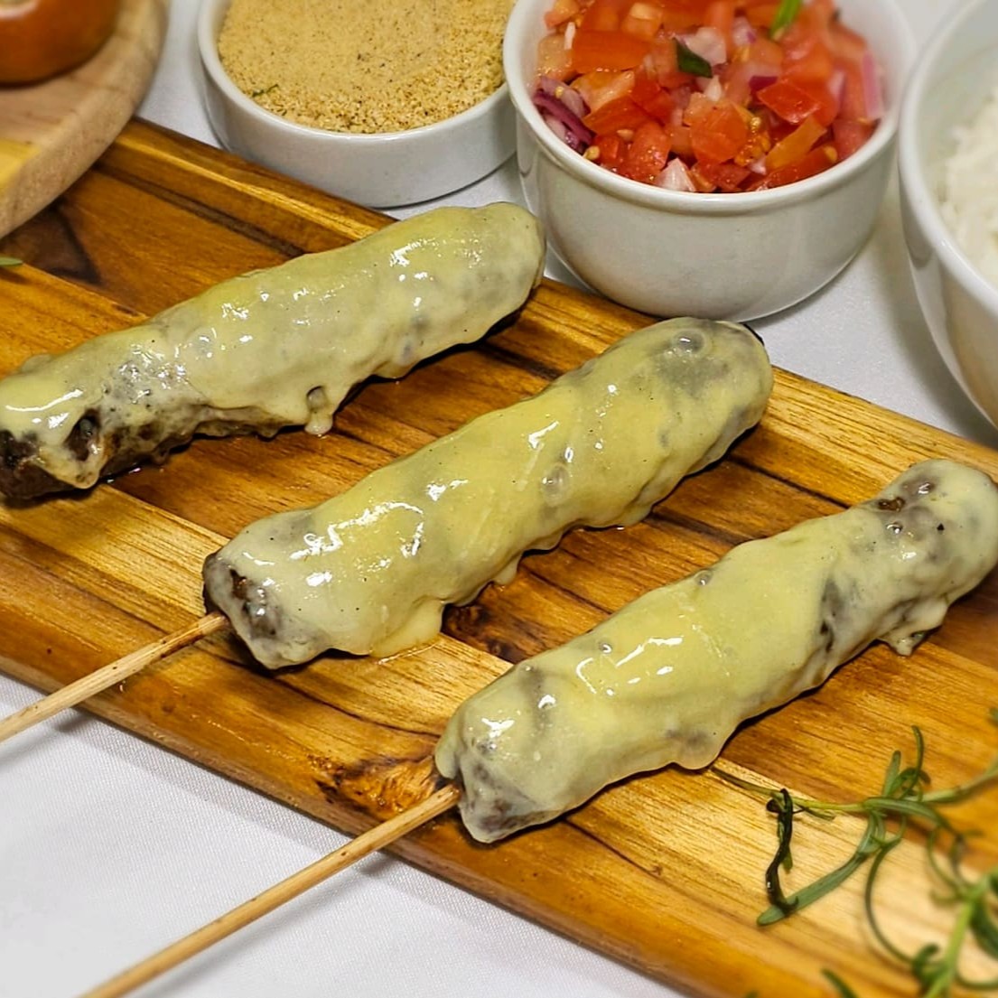 Delicie-se com o nosso Espetinho de Kafta com Queijo! Ao ser derretido na brasa, o queijo adiciona uma camada rica e diferenciada de sabor a esse espetinho. Ideal para quem gosta de sabores especiais. Imagem ilustrativa. Venda por unidade.