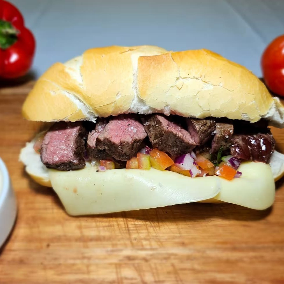 Pão francês fresquinho, com 1 espetinho de carne da Brasa e Espeto, vinagrete e queijo mussarela derretido. Uma refeição simples, leve e saborosa para qualquer hora do Dia.