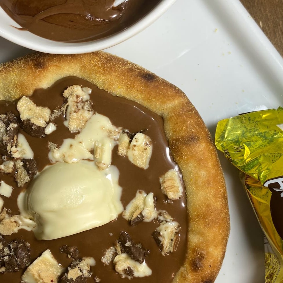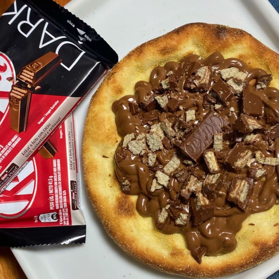 A Clássica Esfiha com massa Artesanal, Chocolate ao Leite, finalizado com chocolate Kitkat Dark picado. Obs.Nossas esfihas possuem aproximadamente 13cm de diâmetro.