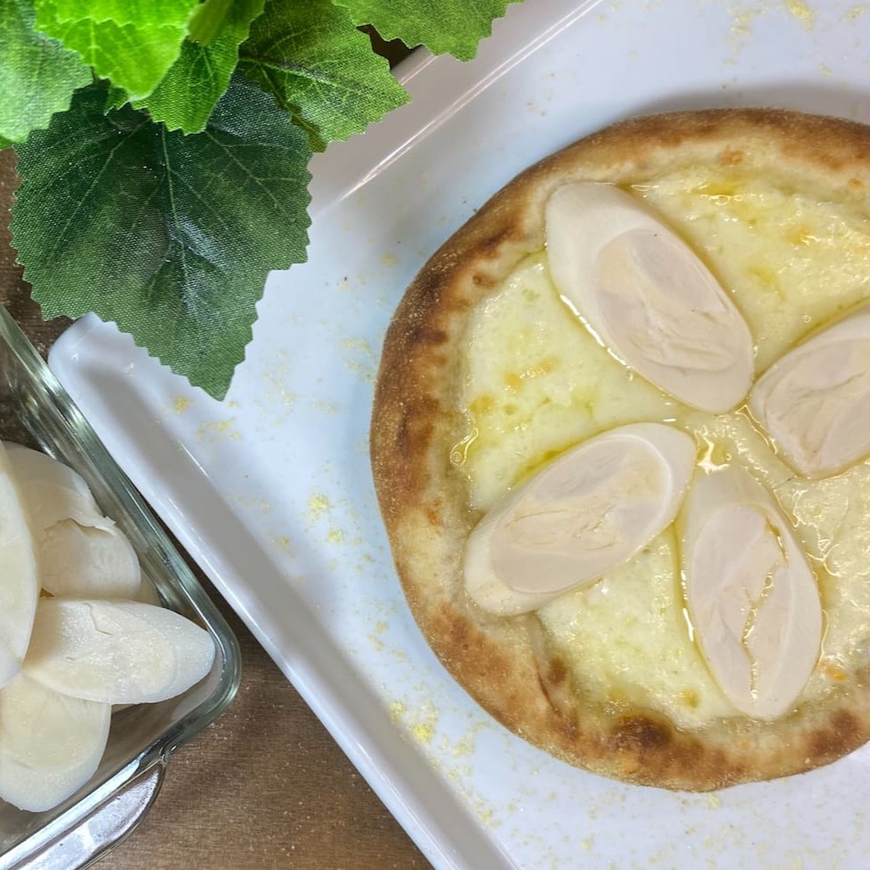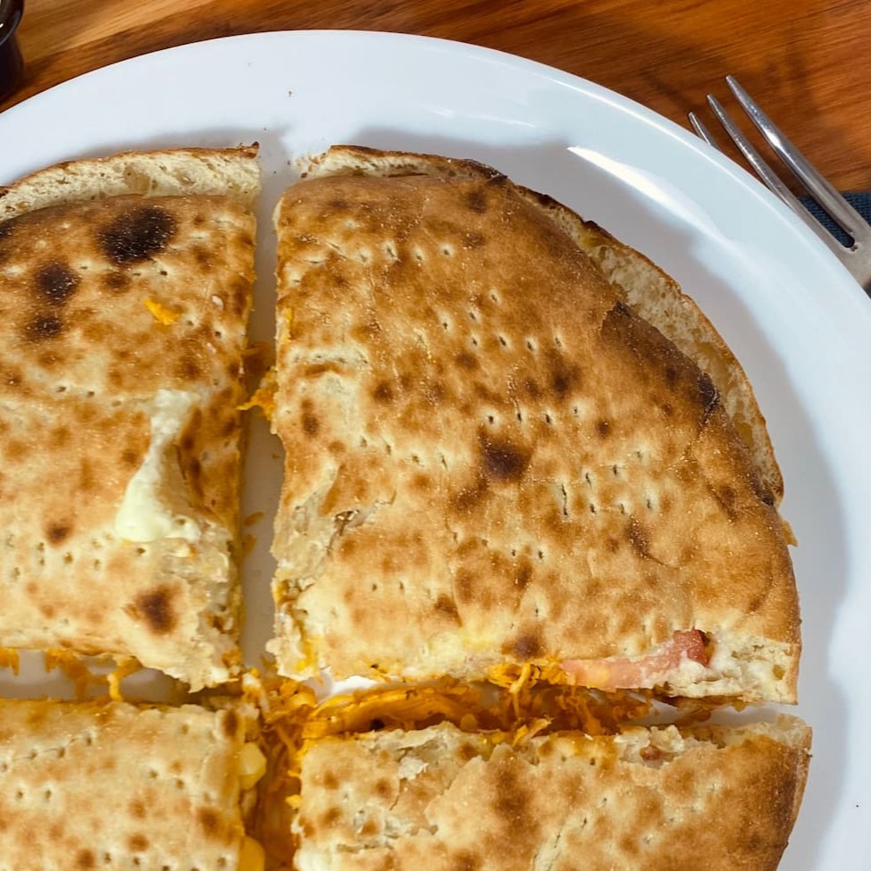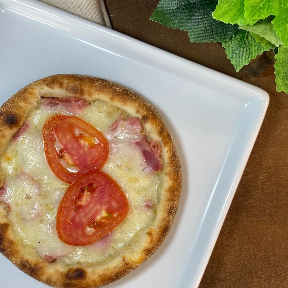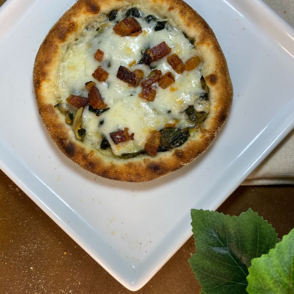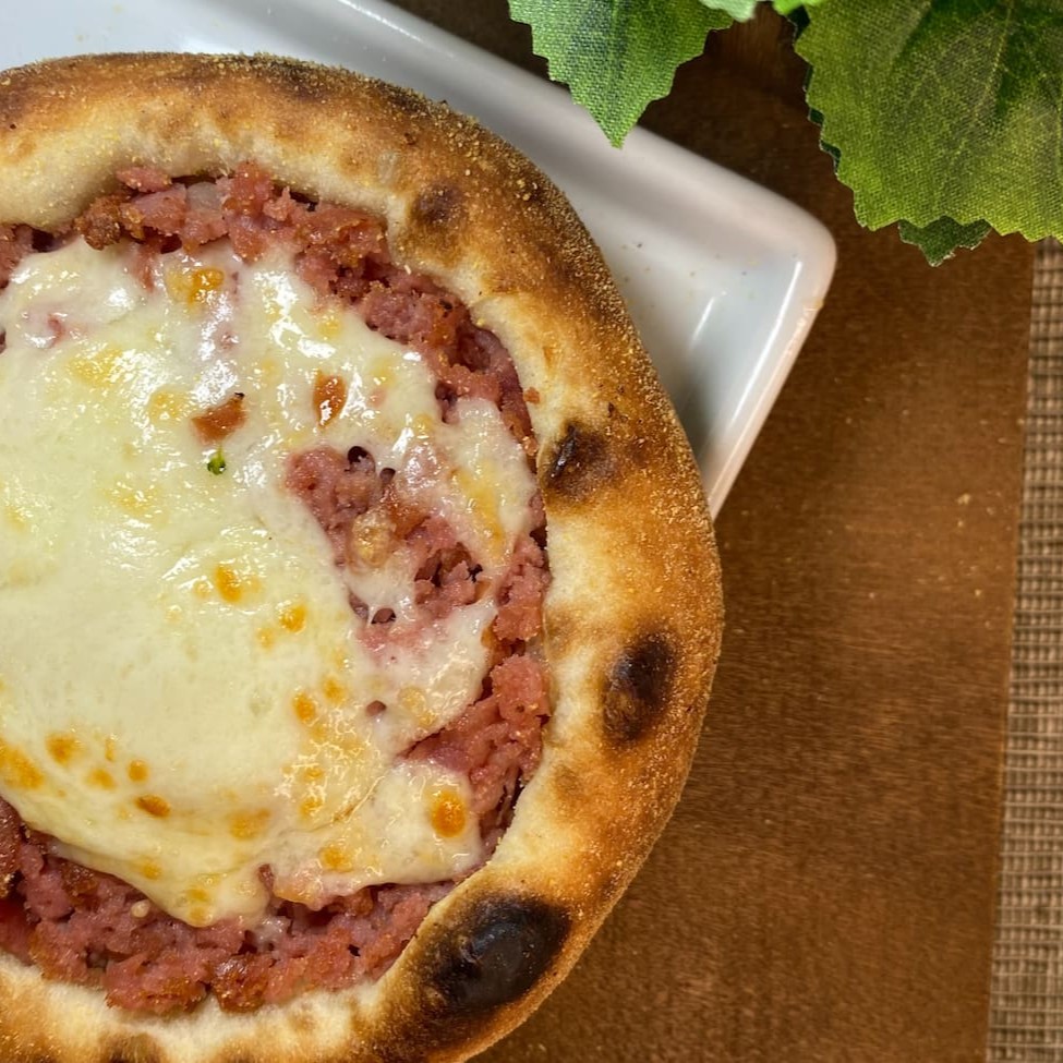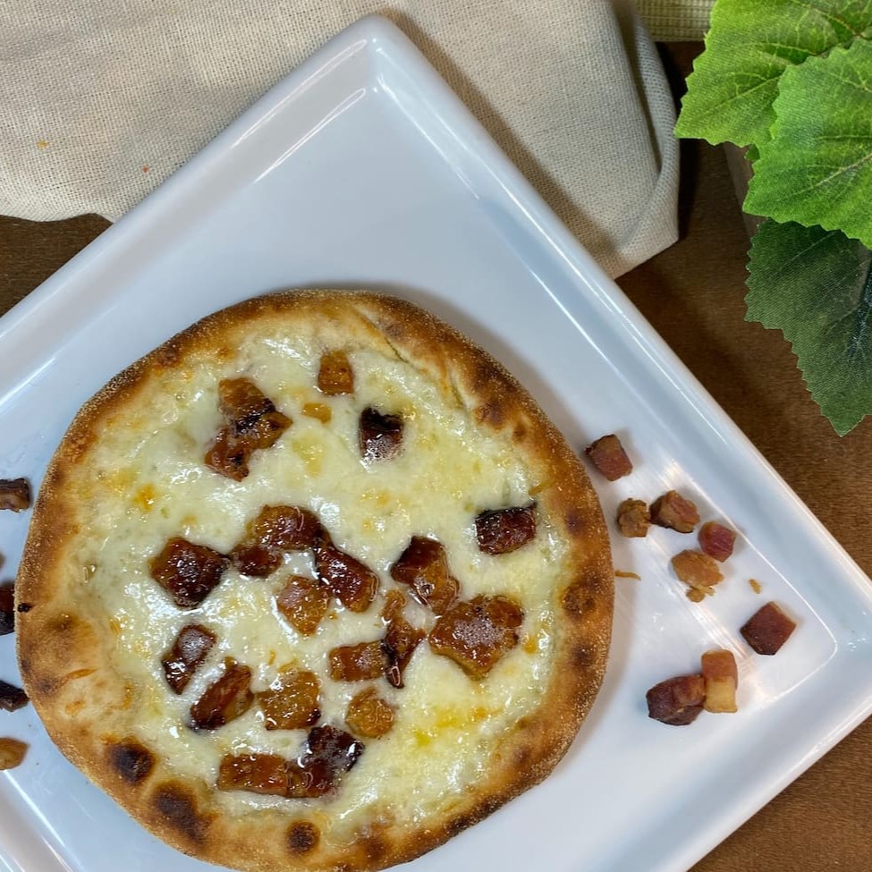 A Clássica Esfiha com massa Artesanal, pedaços de Bacon tostado na Manteiga, finalizada com Queijo Mussarela.