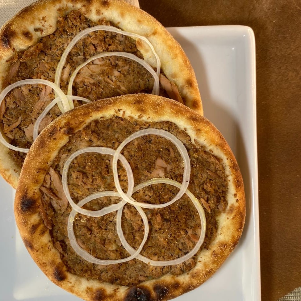 A Clássica Esfiha com massa Artesanal, Atum desfiado e rodelas de cebola.